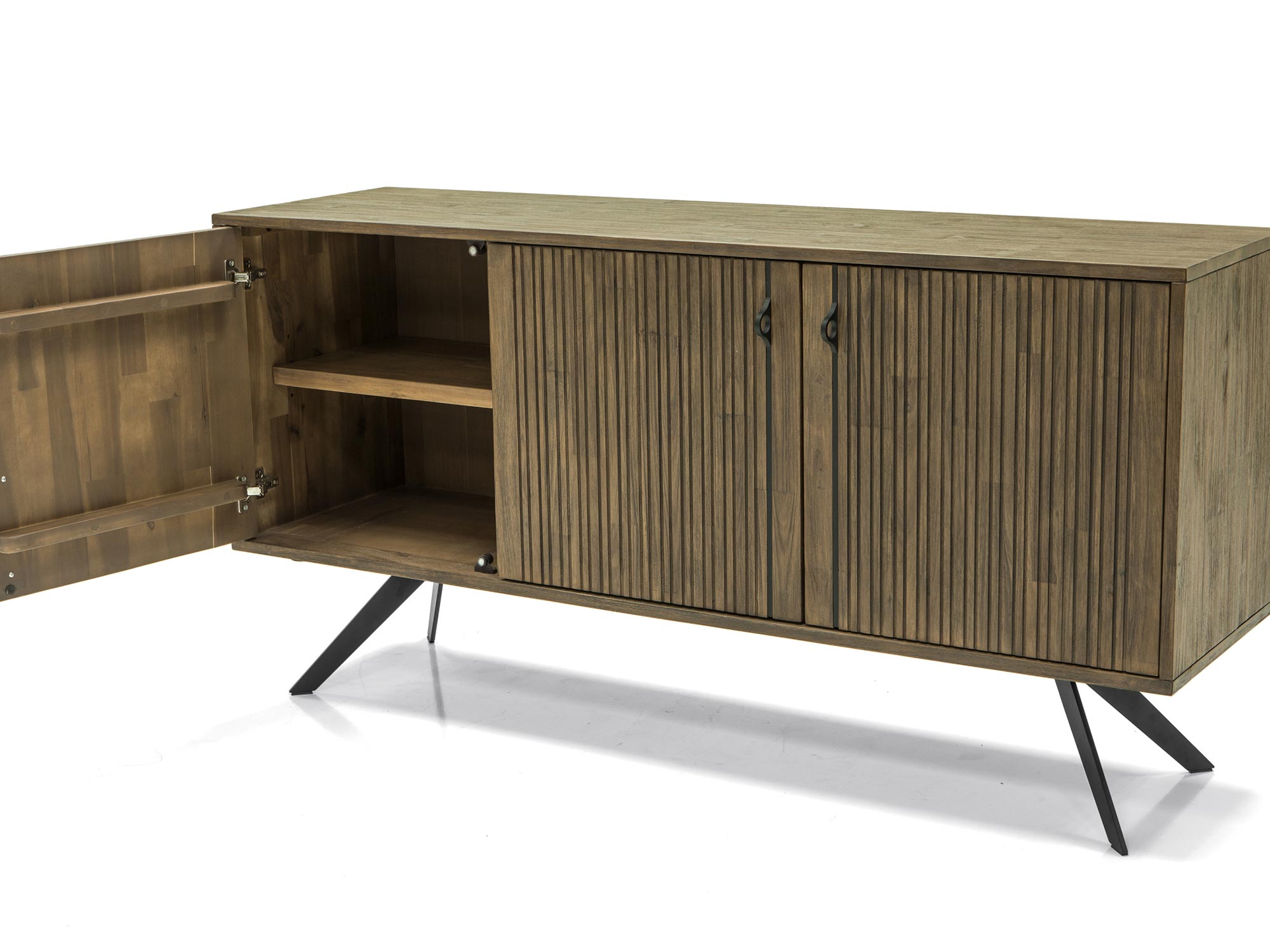 Stylowa komoda Valore łączy elegancki, modern vintage design z wysoką jakością materiałów. Wykonana z drewna akacji, które cechuje się naturalną teksturą, jest solidna, trwała i odporna na uszkodzenia. Ergonomiczne uchwyty z metalu pasują idealnie do designu lameli, nadając meblowi wyrafinowanego wyglądu. Dodatkowo, 3D fronty komody zapewniają nowoczesny akcent w każdym wnętrzu. Dzięki ciemnografitowym nogom, komoda zyskuje stabilność i solidność. Jest to mebel, który łączy estetykę i funkcjonalność, tworząc idealne rozwiązanie do przechowywania w salonie, sypialni czy biurze.