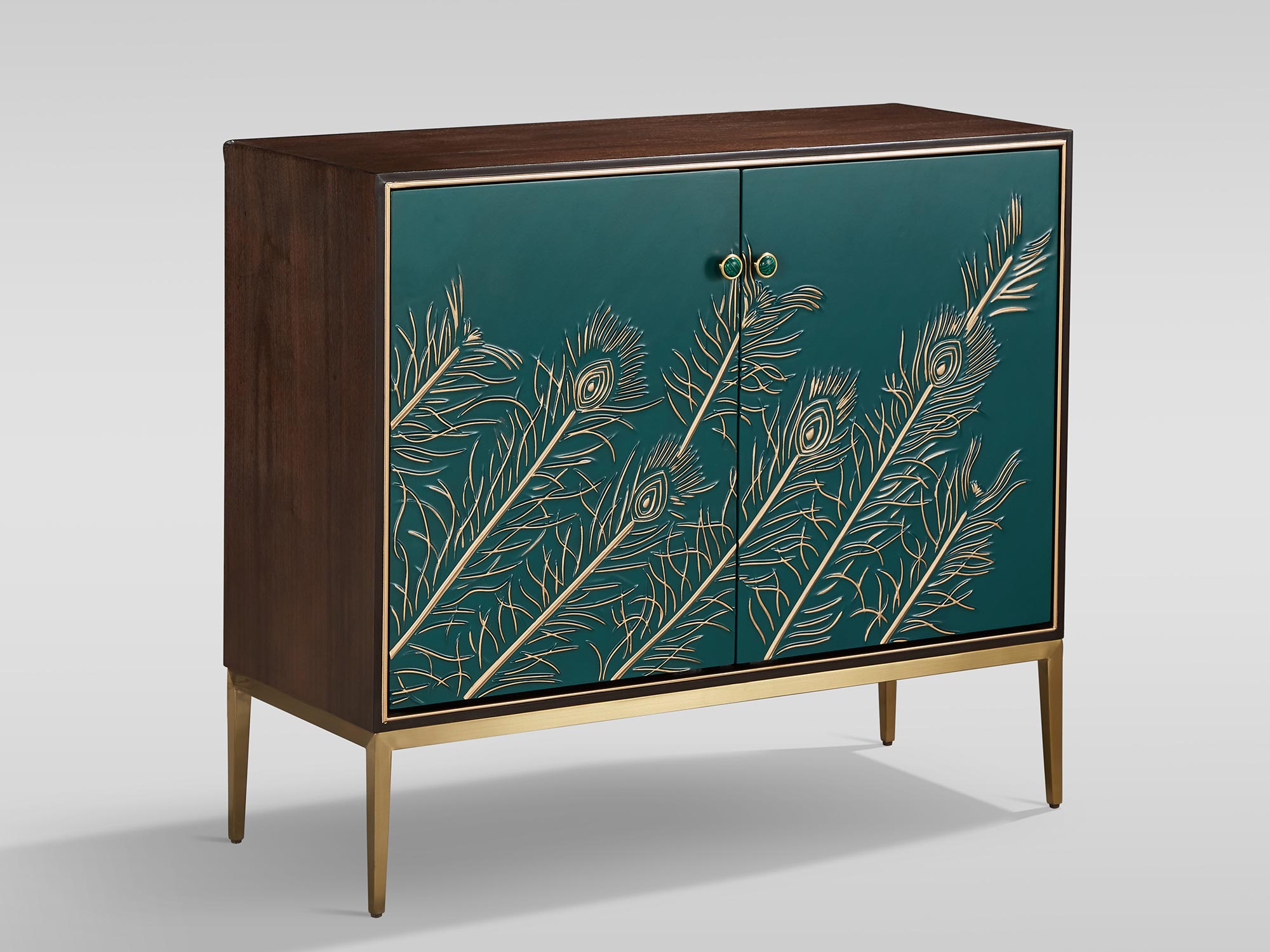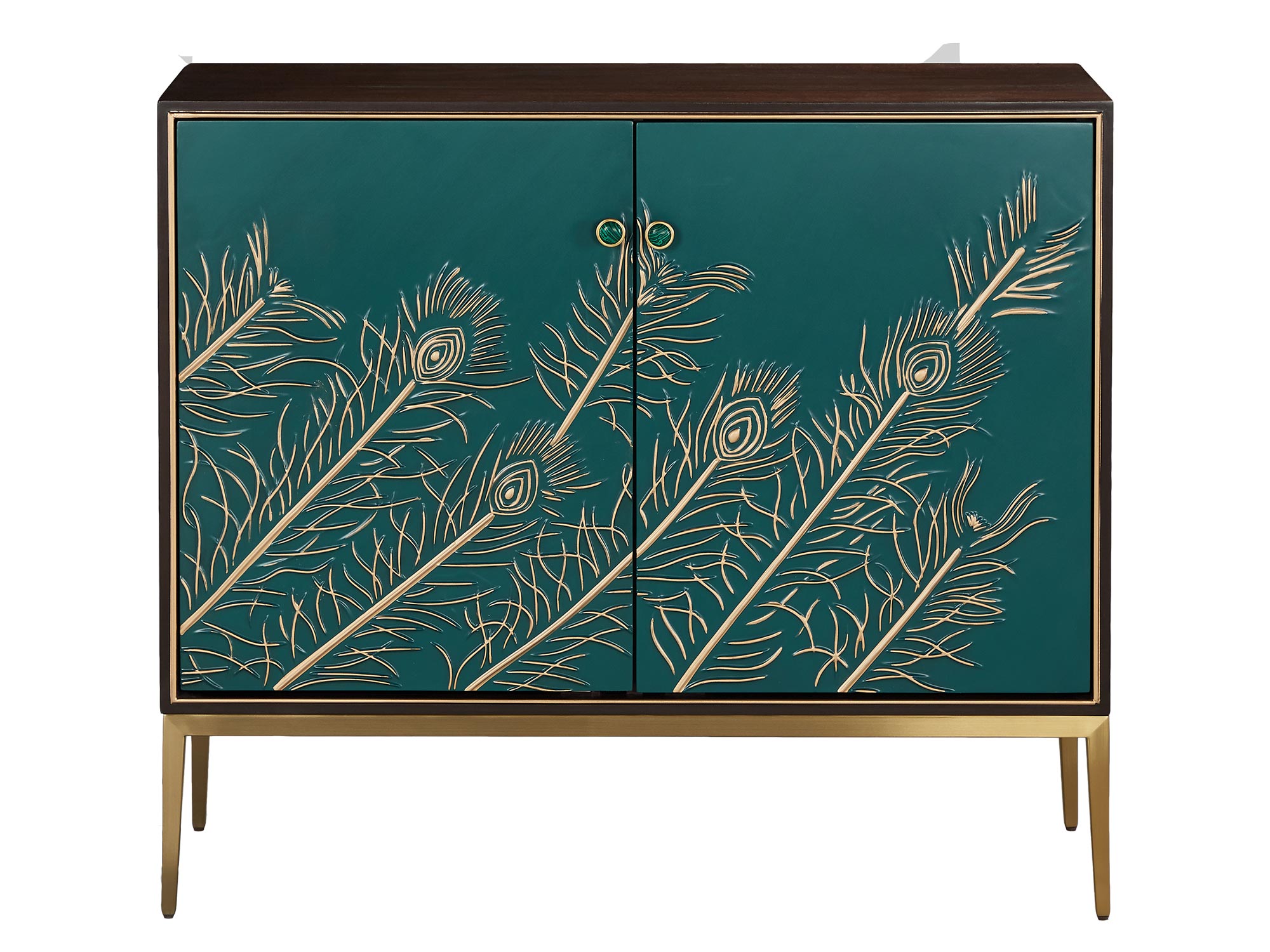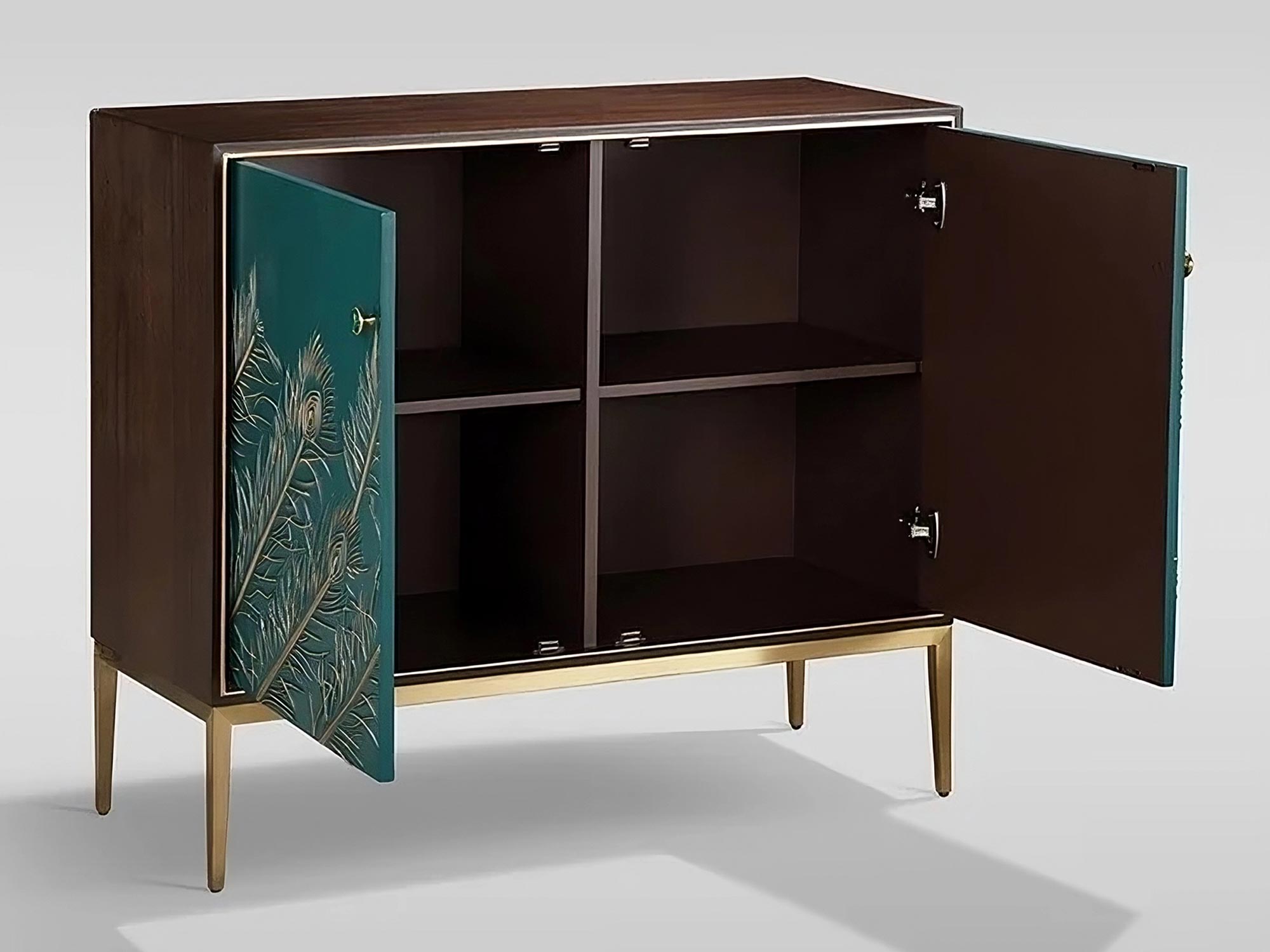 Elegancka komoda w kolorze orzechowym z turkusowym frontem, ozdobiona subtelnymi złotymi akcentami. Wytłoczony złoty wzór pawich piór oraz dekoracyjne złote elementy sprawiają, że mebel stanowi wyjątkową ozdobę każdego wnętrza. Doskonałe połączenie klasyki z nowoczesnością, które wprowadzi do Twojego salonu lub sypialni elegancki, luksusowy charakter. Z funkcjonalnością na najwyższym poziomie, dzięki regulowanej wysokości półek, systemowi soft close oraz regulowanym ślizgaczom.