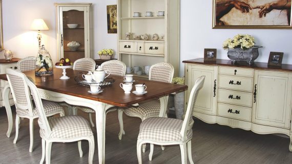 Pokój jadalniany z meblami w stylu francuskim i bieloną komodą