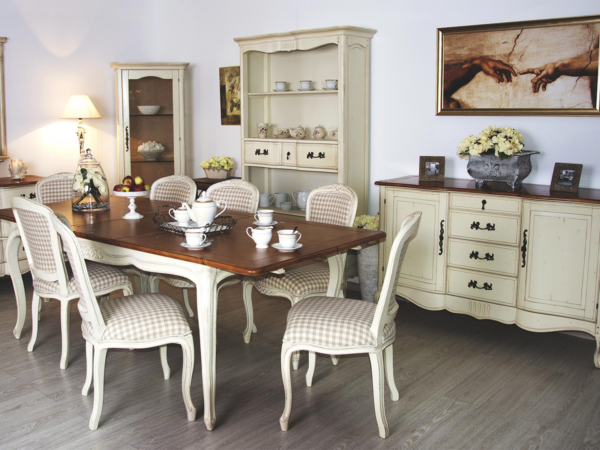 Jadalnia z witryną i stołem w stylu prowansalskim shabby chic
