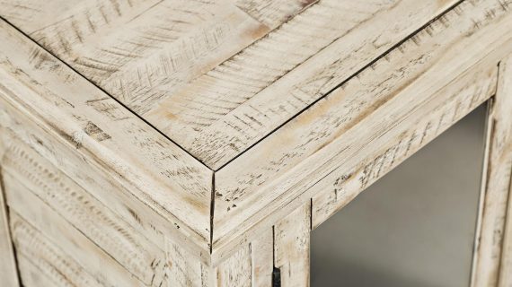 Elegancka komoda w stylu rustykalnym, która wnosi do Twojego wnętrza odrobinę klasycznego uroku. Wykonana z drewna akacji, w kolorze kości słoniowej, z charakterystycznymi postarzeniami i subtelnymi, ozdobnymi listewkami. Przeszklone drzwi i frezowany blat dodają jej wyjątkowego charakteru. To doskonały wybór dla osób, które szukają funkcjonalnego, a zarazem stylowego mebla do swojego salonu, jadalni lub sypialni.