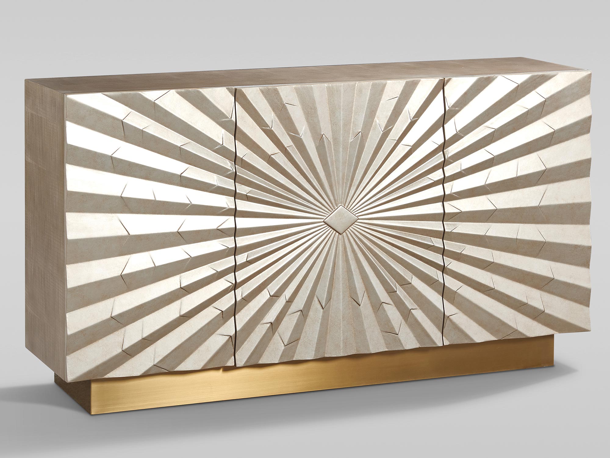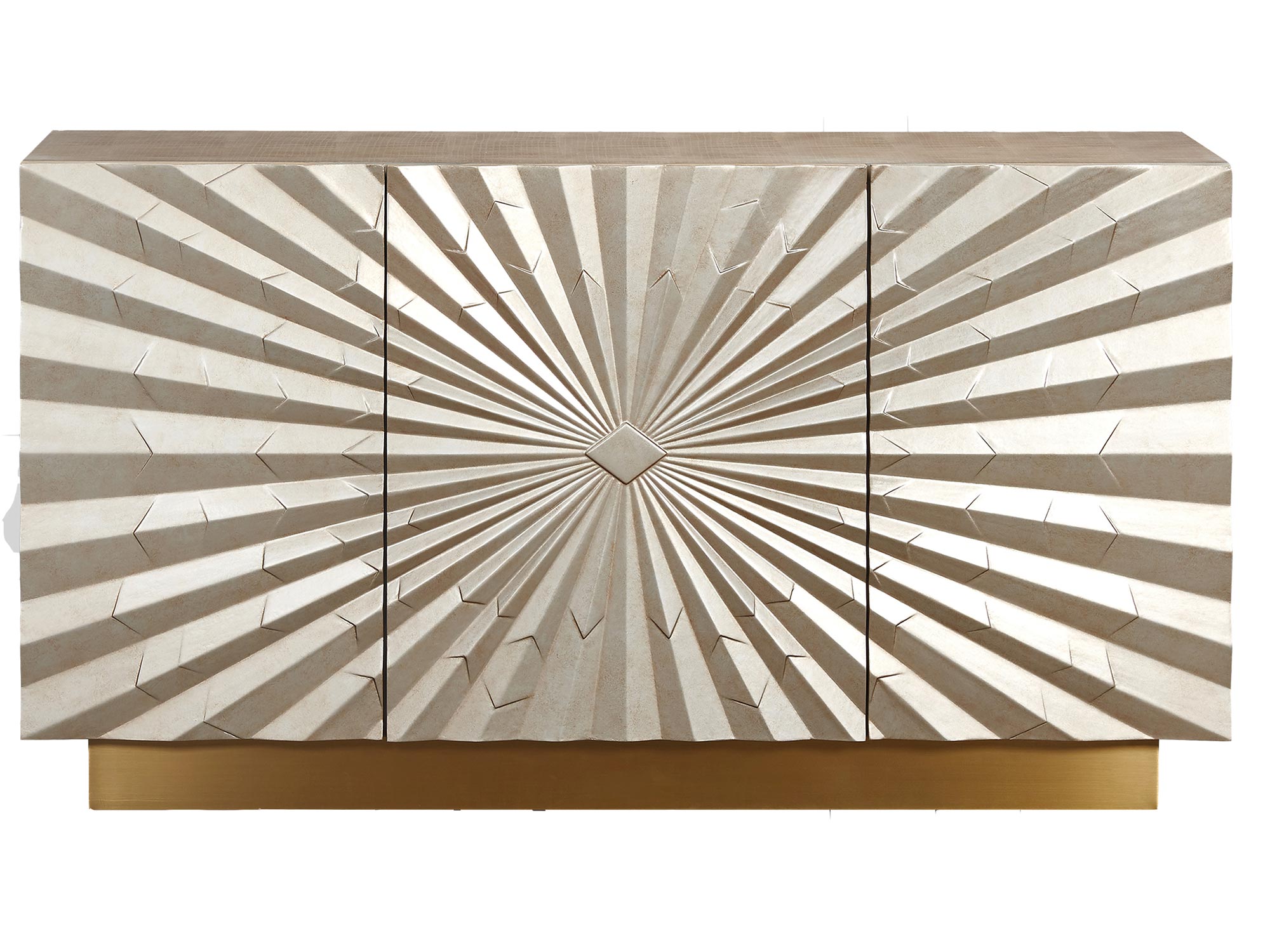 Przenieś sztukę origami do swojego wnętrza dzięki tej wyjątkowej komodzie w kolorze szampańskiego złota. Promienisty wzór frontów przypominający geometryczne kształty origami, w połączeniu z eleganckimi złotymi nogami, stworzy niepowtarzalny akcent w każdym pomieszczeniu.