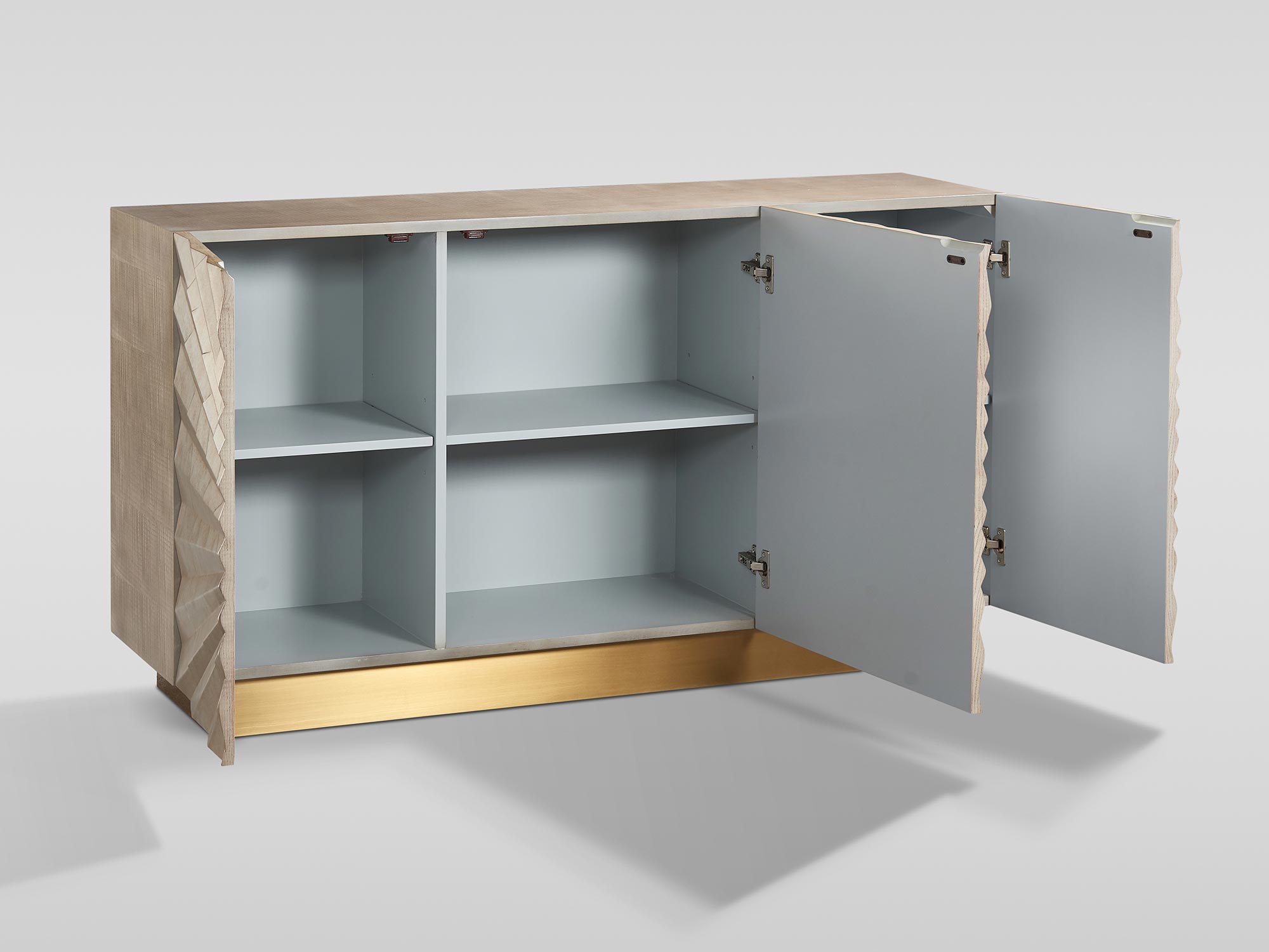 Komoda Eleganza wyróżnia się nie tylko pięknym, parametrycznym wzorem 3D na frontach, ale także funkcjonalnością. Regulowane półki, system soft close oraz łatwa regulacja wysokości ślizgaczy sprawiają, że komoda jest praktyczna w codziennym użytkowaniu. Materiał wykonania – okleina jesionowa i stal nierdzewna – zapewniają trwałość i solidność, jednocześnie nadając komodzie luksusowego wyglądu.