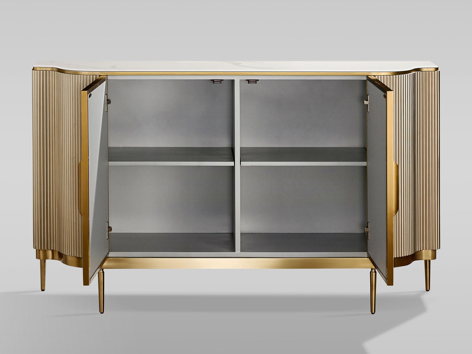 Komoda w kolorze szampańskiego złota wyróżnia się unikalnym frontem wykonanym z naturalnej muszli morskiej, która układa się w symetryczny wzór, nadając meblowi subtelną elegancję. Korpus mebla jest wykonany z wysokiej jakości ryflowanego drewna, a marmurowy blat dodaje luksusowego charakteru. Złote akcenty oraz nóżki w kolorze szampańskiego złota dopełniają całości, tworząc wyjątkowy mebel, który pasuje do nowoczesnych, klasycznych i eleganckich wnętrz.