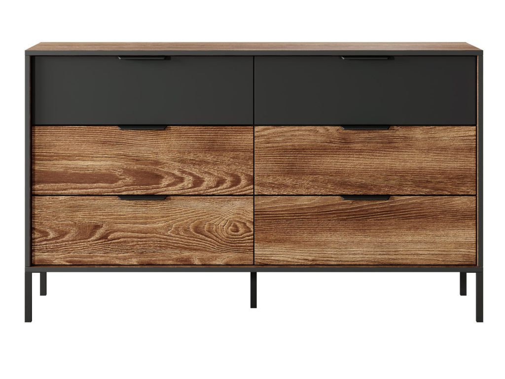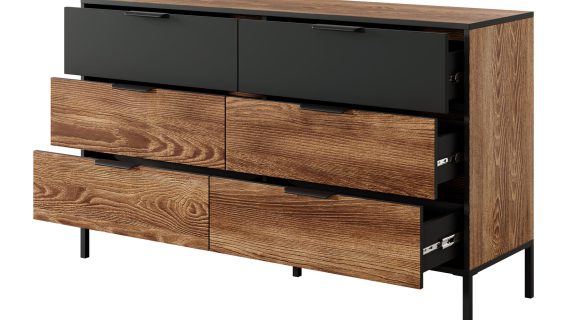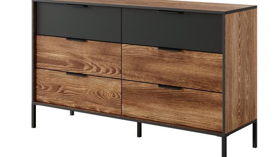 Komoda do Sypialni Castano w Stylu Industrialnym to idealne rozwiązanie dla tych, którzy pragną połączyć nowoczesny design z wysoką funkcjonalnością. Wykonana z najwyższej jakości materiałów, gwarantuje trwałość i estetykę. Ponadto, innowacyjne rozwiązania techniczne zapewniają komfort użytkowania. Dlatego, dzięki subtelnej kolorystyce kasztanu i antracytu oraz nowoczesnemu designowi, komoda Castano doskonale wkomponuje się w każdą sypialnię, dodając jej elegancji i stylu.