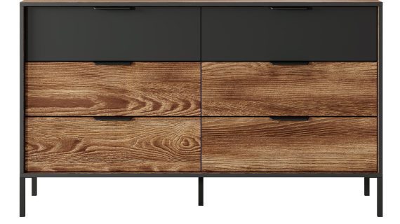 Komoda do Sypialni Castano w Stylu Industrialnym zachwyca swoim nowoczesnym designem i subtelną kolorystyką. Kolor kasztanowy w połączeniu z antracytem nadaje wnętrzu ciepła i harmonii, natomiast czarne metalowe nogi dodają meblowi nowoczesnego charakteru i stabilności. Ponadto, minimalistyczny design sprawia, że komoda idealnie komponuje się z różnorodnymi aranżacjami wnętrz. Dlatego właśnie ta komoda jest tak wyjątkowa.