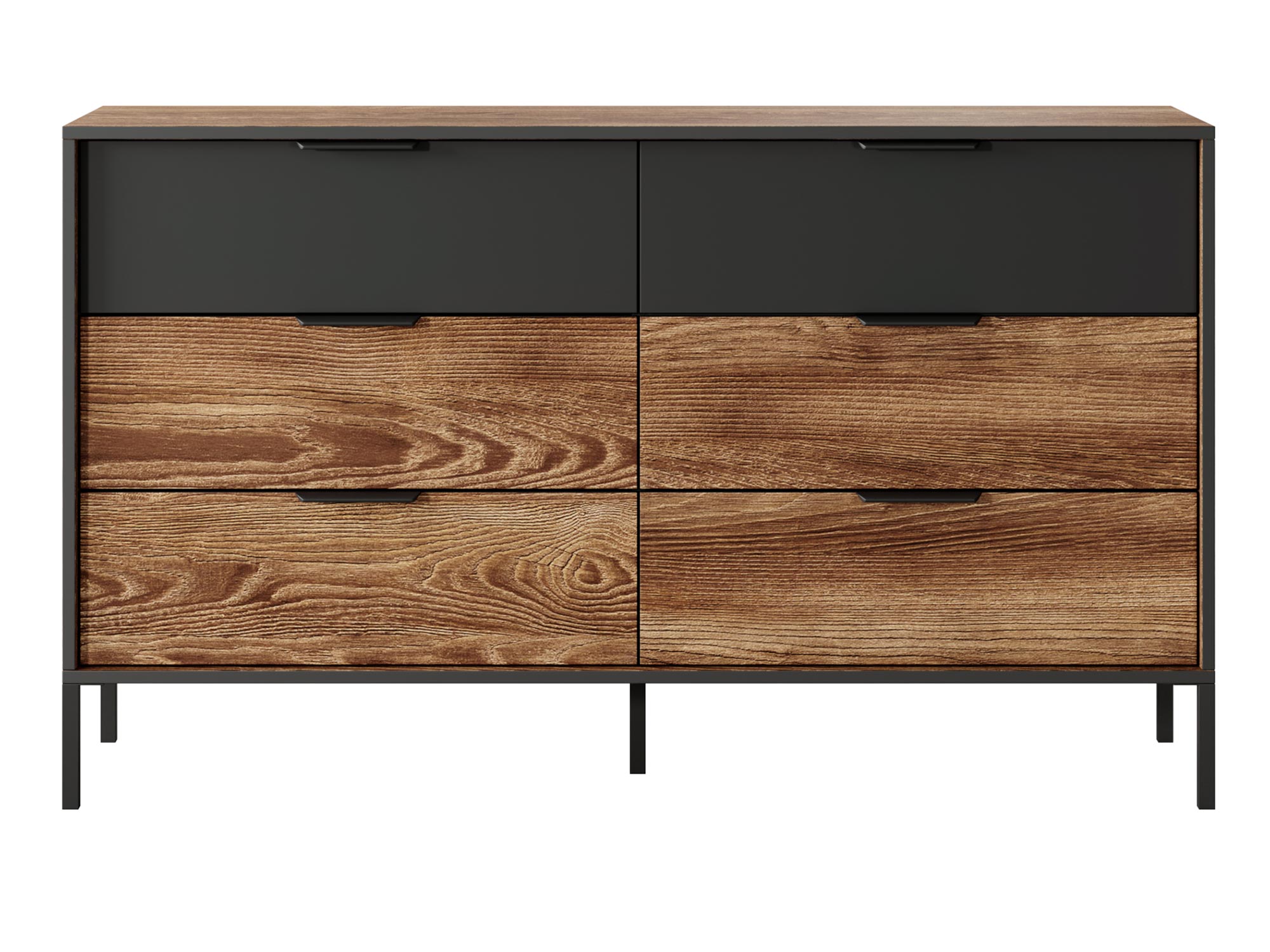 Komoda do Sypialni Castano w Stylu Industrialnym wyposażona jest w innowacyjne mechanizmy, które zwiększają komfort użytkowania. Zawiasy wpuszczane oraz bliźniacze z domykiem gwarantują płynne otwieranie i zamykanie drzwi oraz szuflad. Ponadto, kulkowe prowadnice szuflad z pełnym wysuwem i domykiem zapewniają łatwy dostęp do przechowywanych przedmiotów. Metalowe, czarne nogi oraz uchwyty w matowym wykończeniu podkreślają nowoczesny design mebli. Dlatego te innowacyjne rozwiązania techniczne są tak ważne.