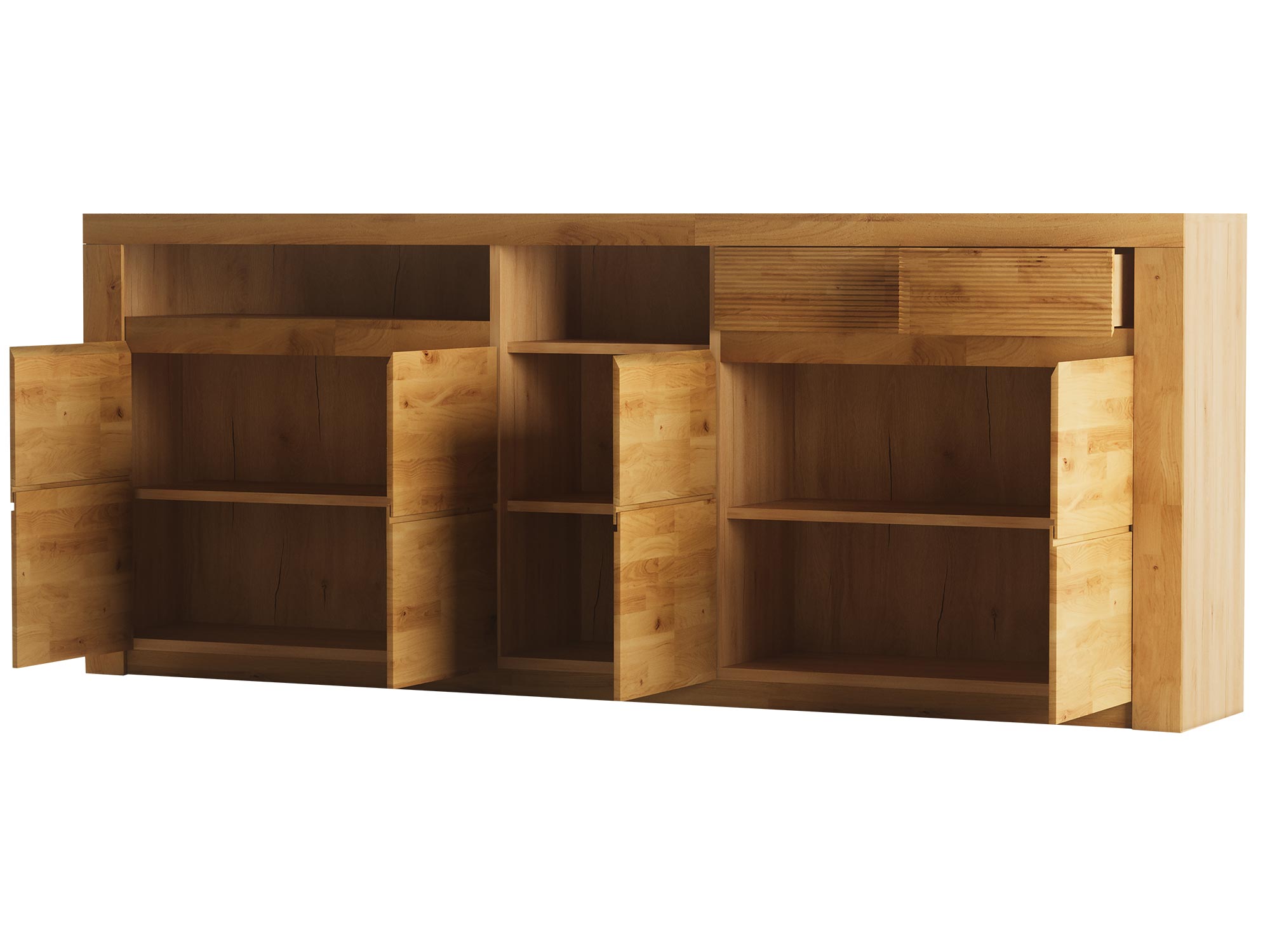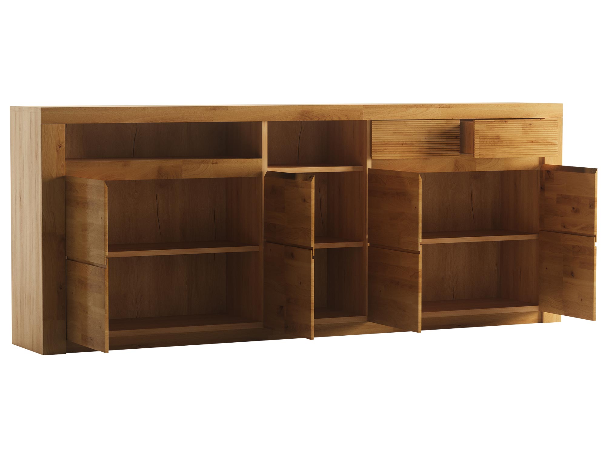 Castoro 35 to komoda stworzona dla tych, którzy pragną połączyć spektakularny efekt wizualny z absolutną wygodą użytkowania. Już sama szerokość 200 cm robi wrażenie – mebel porządkuje przestrzeń i dodaje wnętrzu harmonii, a przy tym oferuje imponującą pojemność. Fronty z olejowanego drewna dębowego łączonego na mikrowczepy przyciągają wzrok subtelnym połyskiem i charakterystycznym rysunkiem słojów. To komoda, która spełni Twoje codzienne potrzeby i jednocześnie podniesie estetykę salonu czy jadalni.
