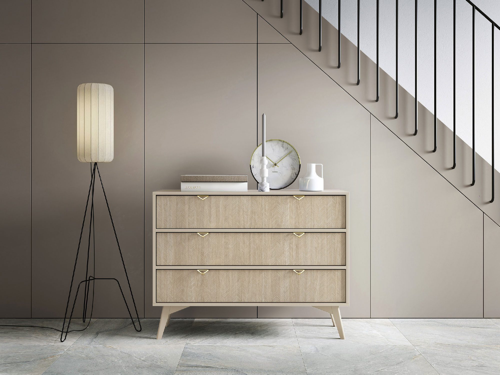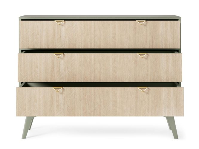 • Eleganckie złote uchwyty – dodają komodzie luksusowego wyglądu, jednocześnie podkreślając jej funkcjonalność.