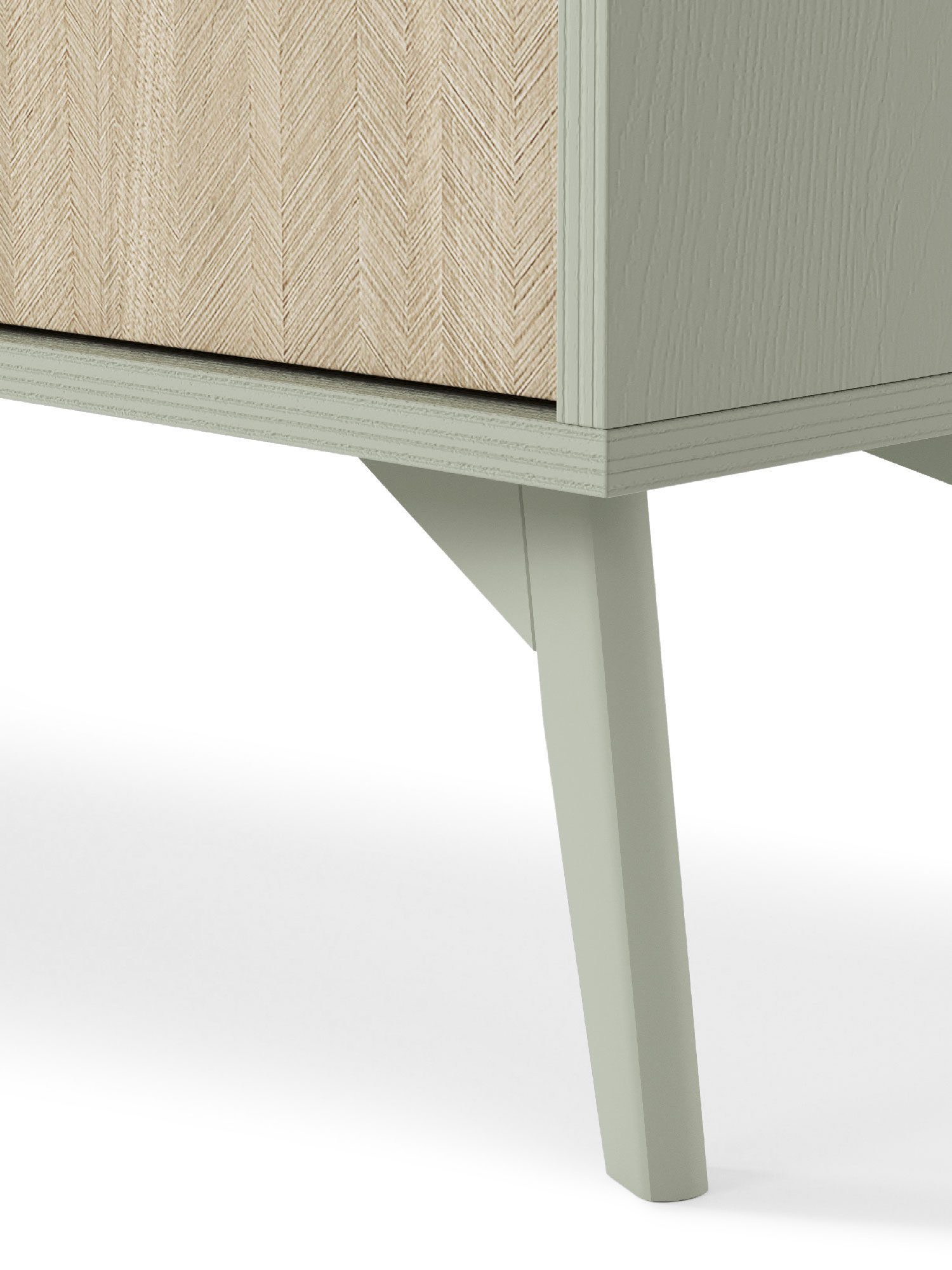 Poznaj Komodę Las Minimalistyczną 106cm, mebel, który perfekcyjnie łączy funkcjonalność z nowoczesnym, inspirowanym naturą designem. Korpus w eleganckim odcieniu eukaliptusowym i fronty w dekorze jodełki scandi nadają komodzie świeżości i stylu, wprowadzając atmosferę harmonii i bliskości z naturą do Twojego domu. Złote uchwyty oraz lakierowane nogi z drewna bukowego nie tylko dodają subtelnej elegancji, ale zapewniają stabilność i trwałość mebla.