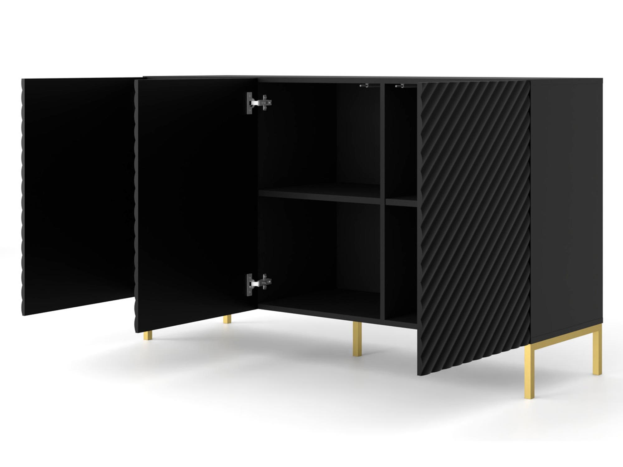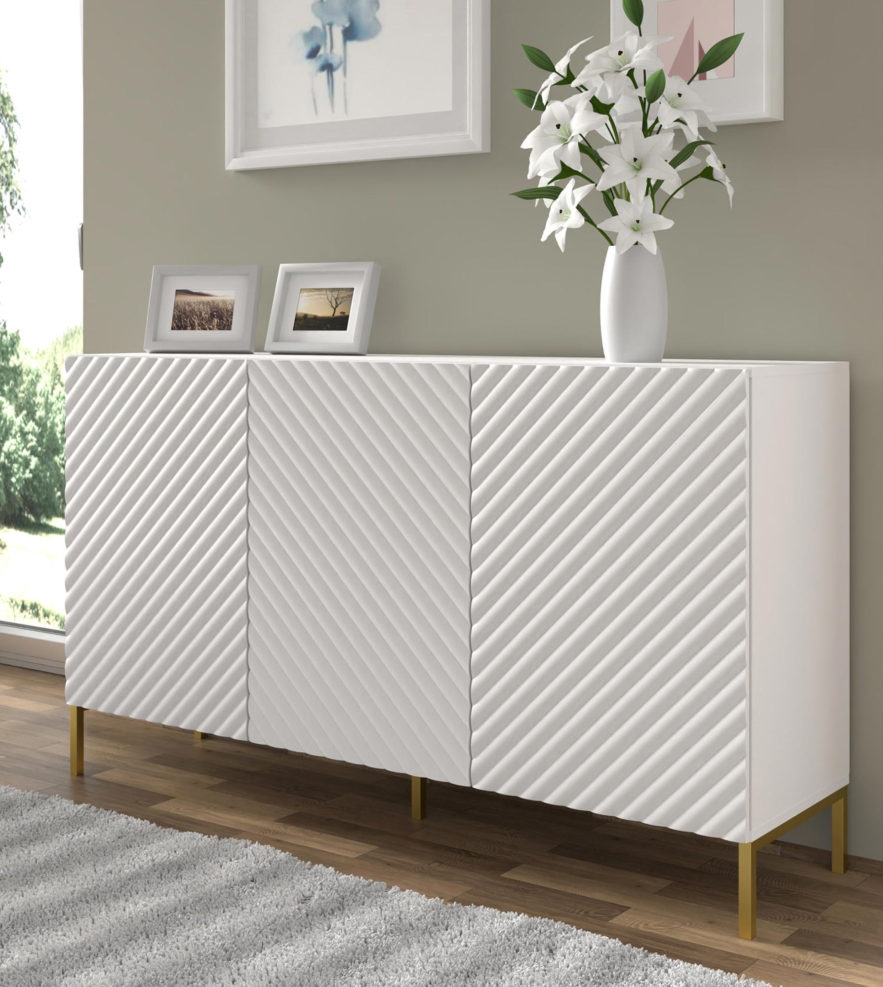 Komoda Loom zachwyca dbałością o detale i precyzyjnym wykonaniem. Frezowane fronty i subtelnie malowane detale nadają jej nowoczesnego wyglądu, który doskonale komponuje się z różnymi stylami wnętrzarskimi. Złote metalowe nogi dodają lekkości i elegancji, sprawiając, że komoda staje się centralnym punktem każdego pomieszczenia.