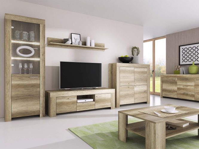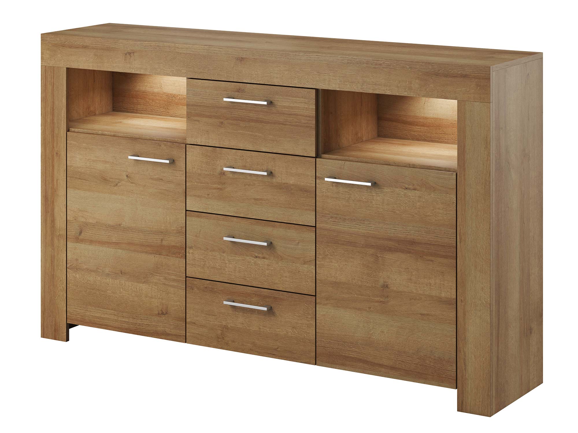 - Klasyczna estetyka z nowoczesnym akcentem – Dębowy dekor komody tworzy atmosferę ciepła i przytulności, natomiast prosty uchwyt i minimalistyczne detale dodają jej nowoczesnego charakteru.