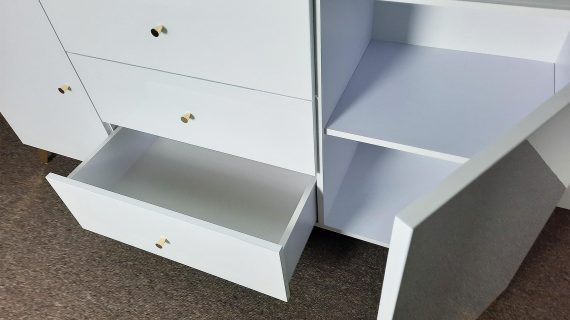 - Wysokiej jakości materiały: Solidny korpus z płyty laminowanej, a fronty z płyty MDF z wykończeniem lakierowanym.