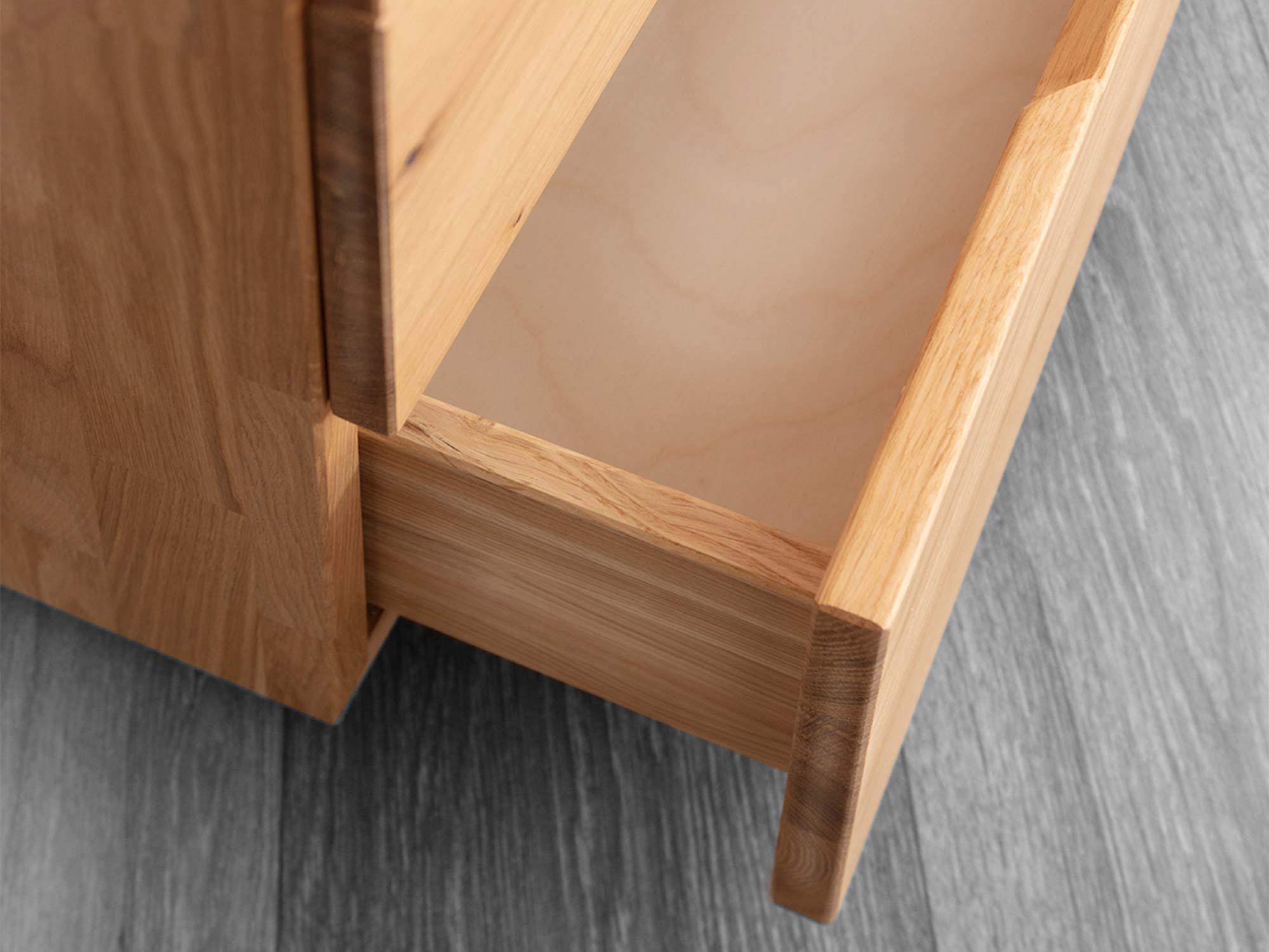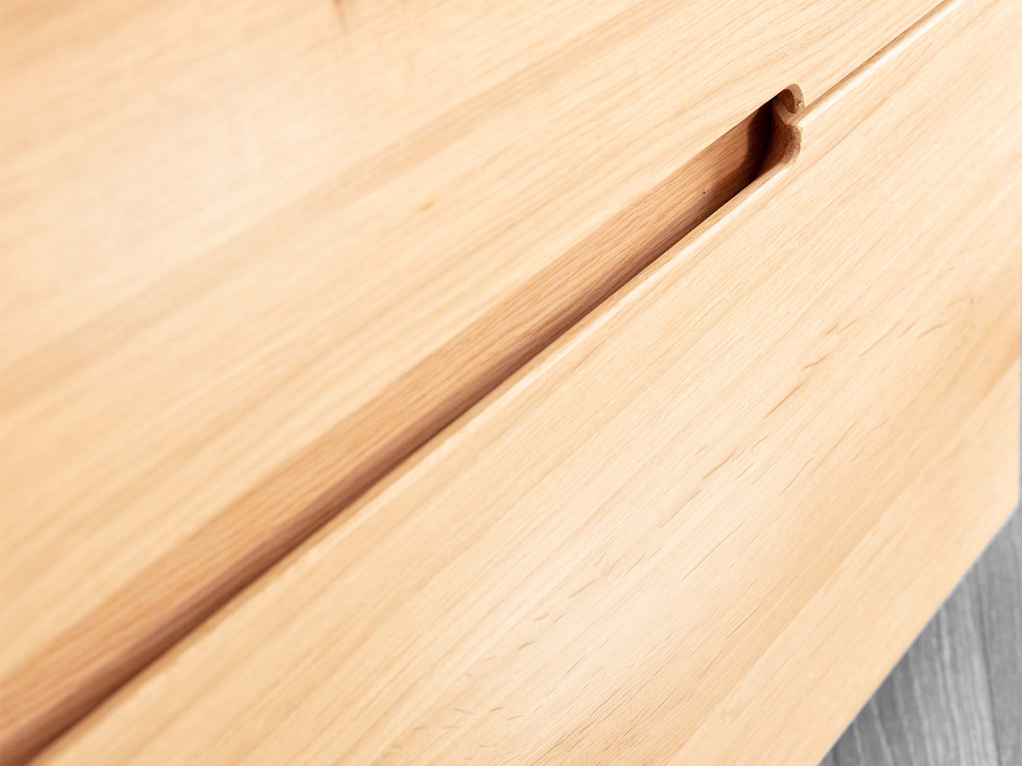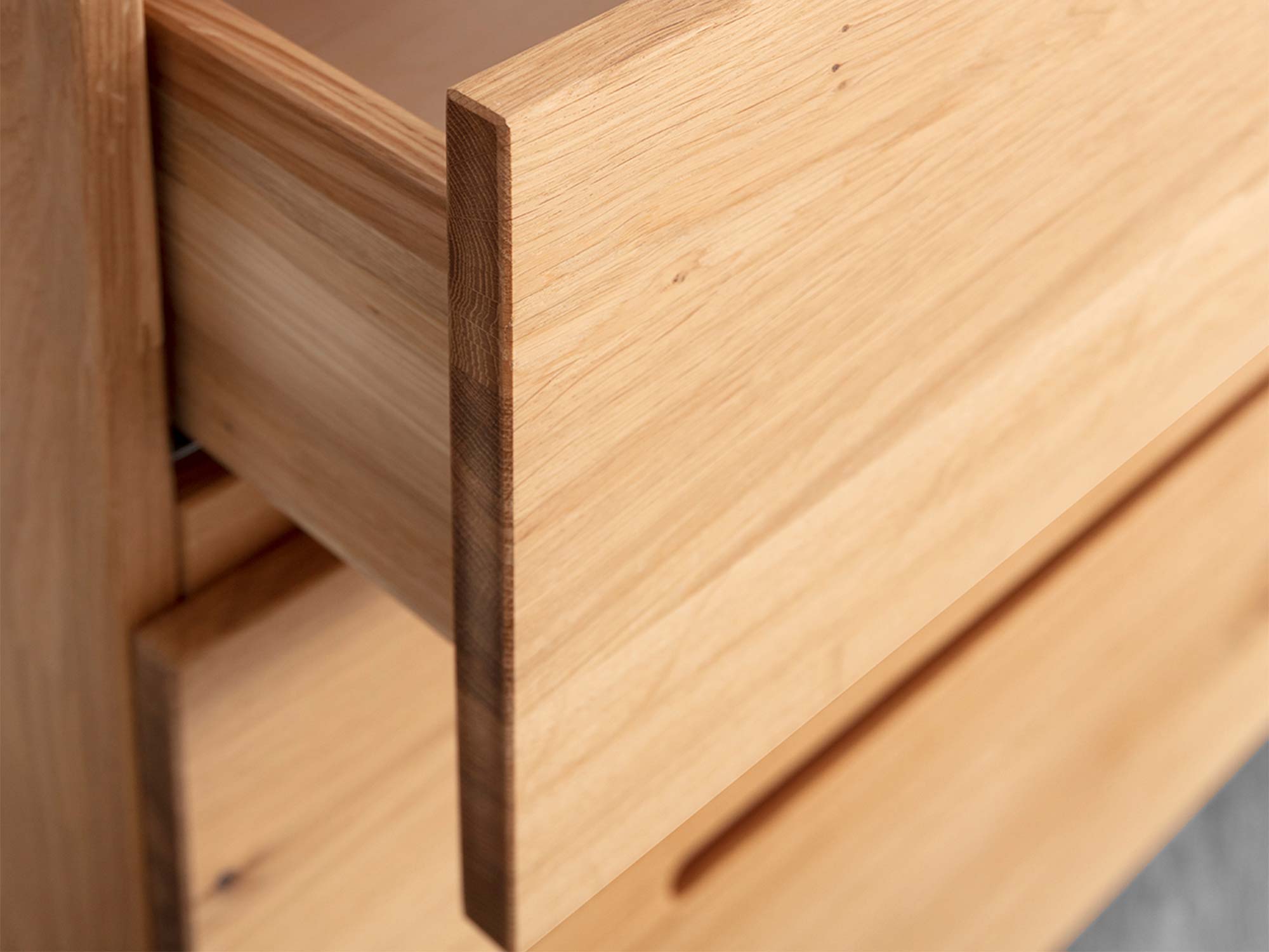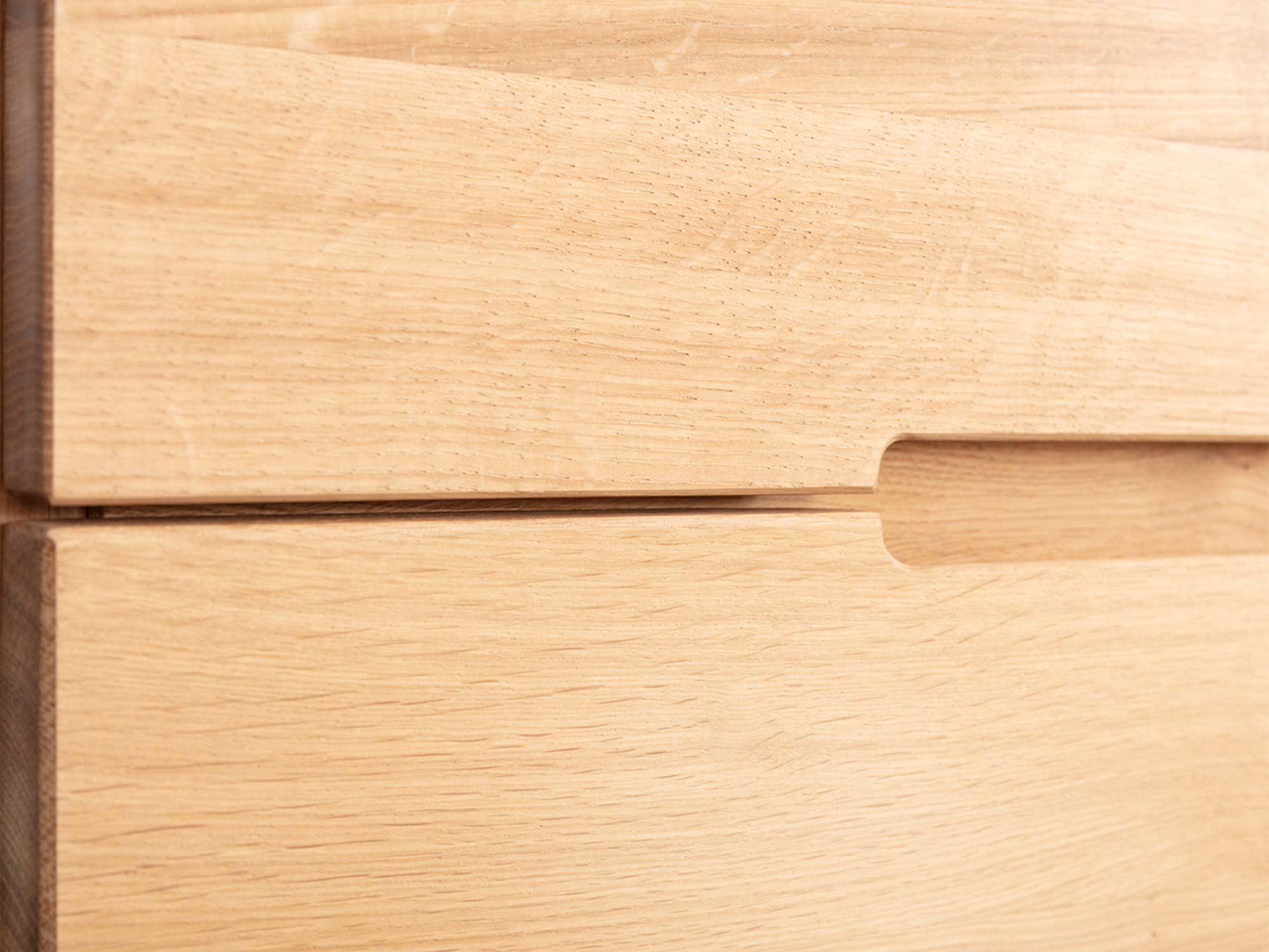 Projekt, który pracuje dla Ciebie. Minimalistyczne, frezowane uchwyty (grifflos) sprawiają, że fronty są gładkie i nowoczesne – nic nie odstaje, nic nie haczy, nic nie zaburza spokojnej linii komody. Dzięki temu bryła prezentuje się lekko i ponadczasowo, a do tego jest wygodna w użytkowaniu: wystarczy wsunąć dłoń w delikatne frezowanie, aby otworzyć pojemną szufladę.