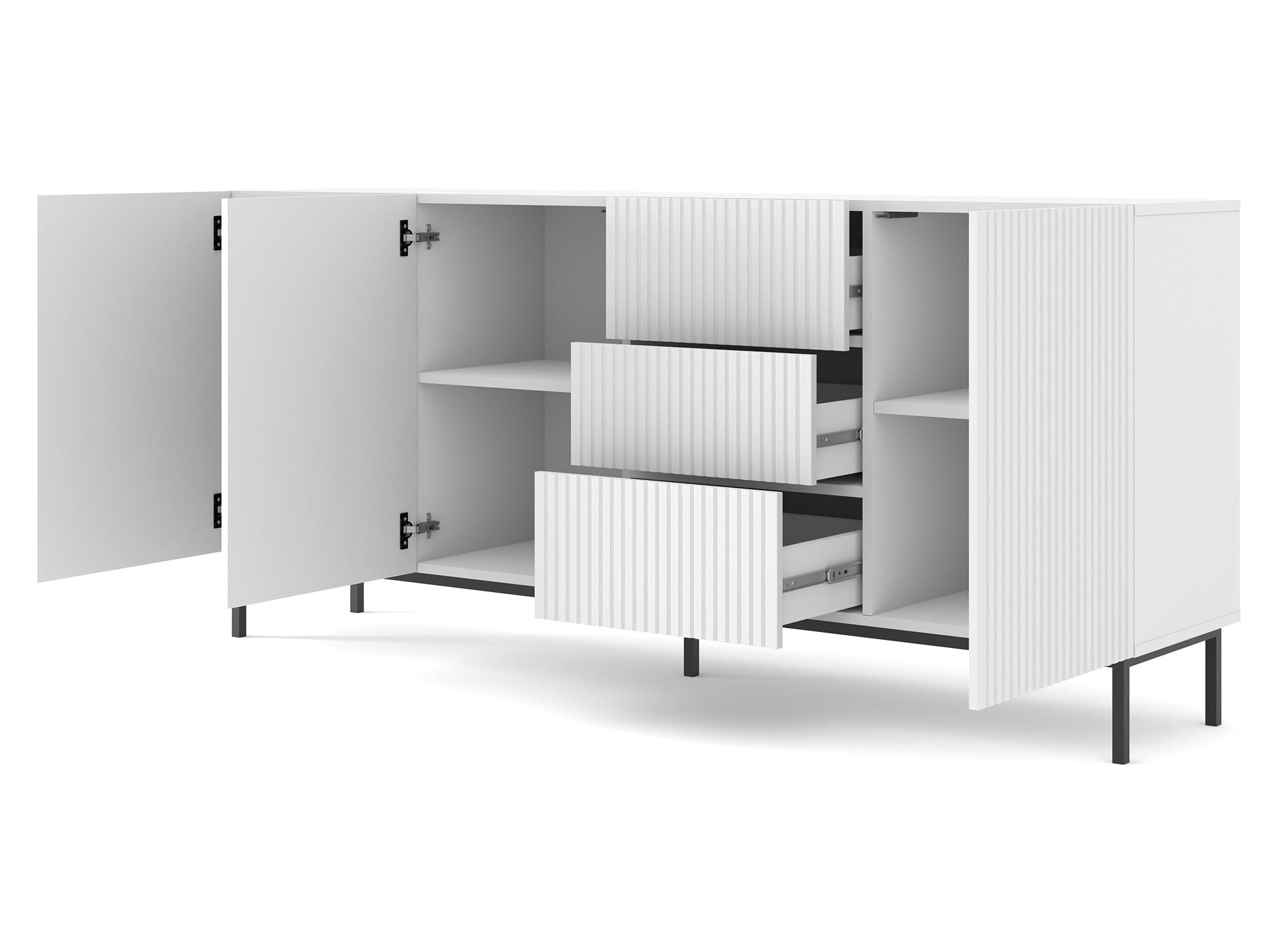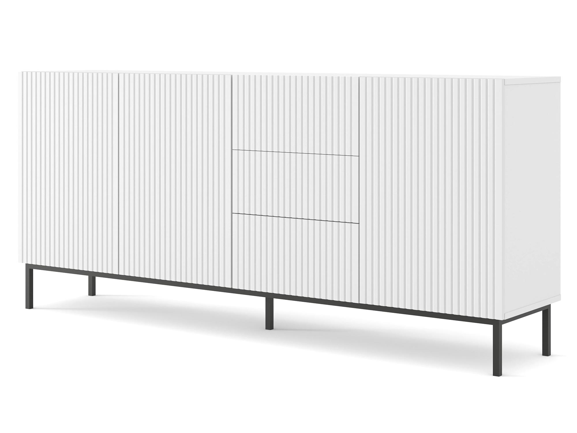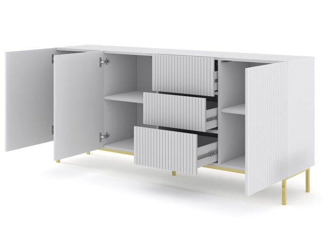Komoda Navia wyróżnia się nowoczesnym designem, który z łatwością dopasuje się do różnych stylów aranżacyjnych. Złote, metalowe nóżki dodają jej luksusowego charakteru, a biały matowy korpus wprowadza świeżość i lekkość do wnętrza. To idealny mebel dla osób, które cenią sobie zarówno estetykę, jak i funkcjonalność.
