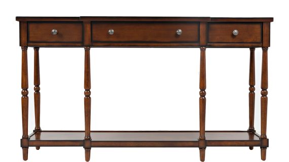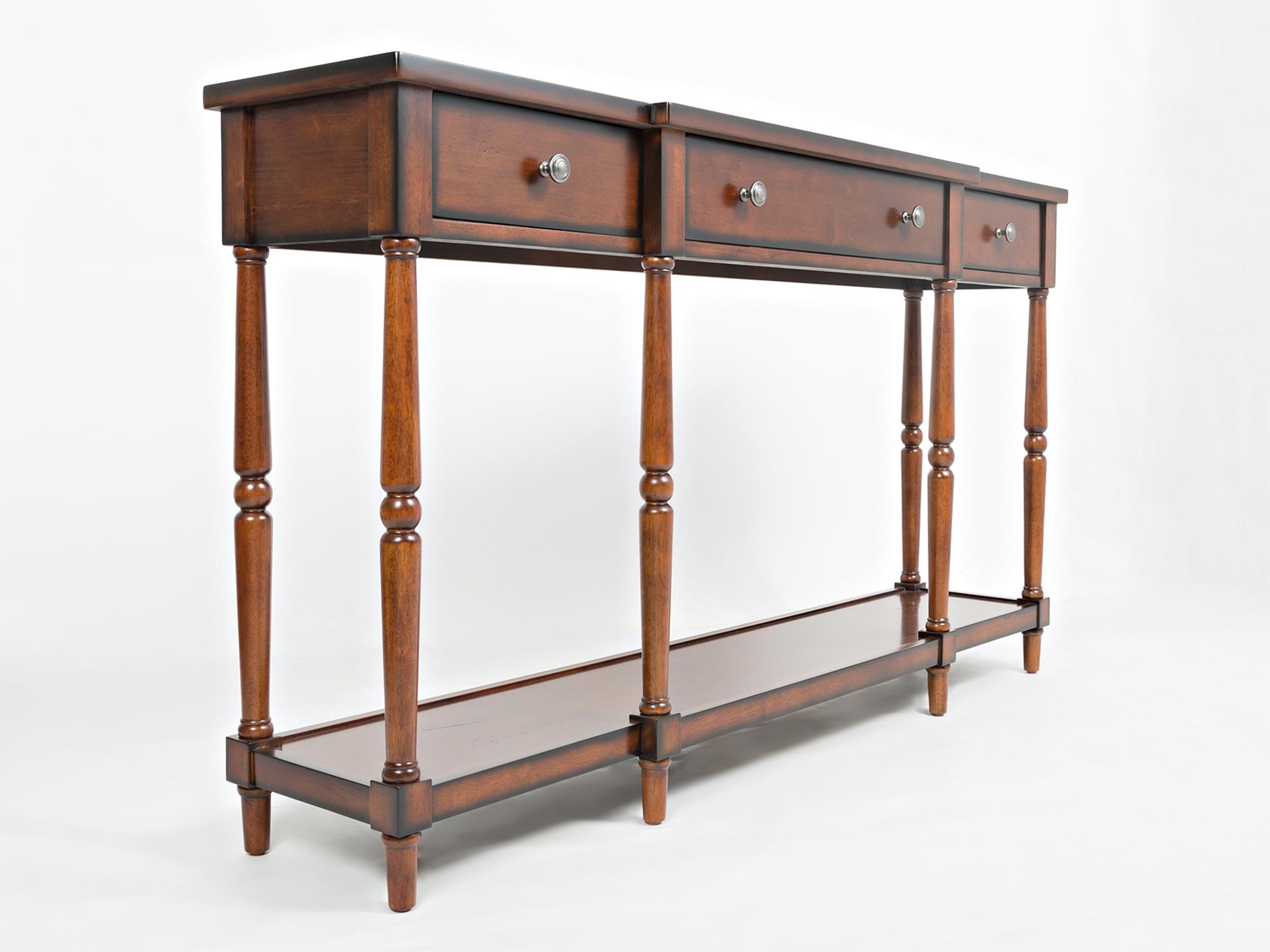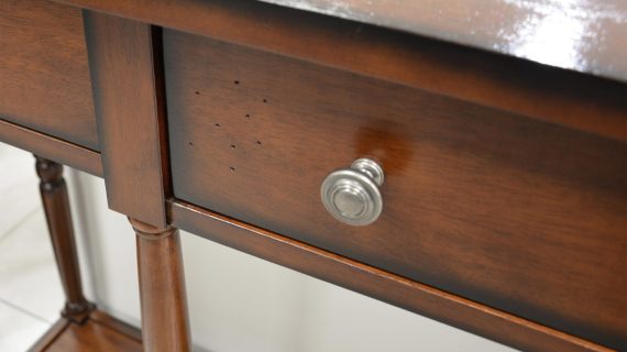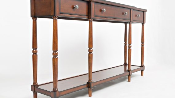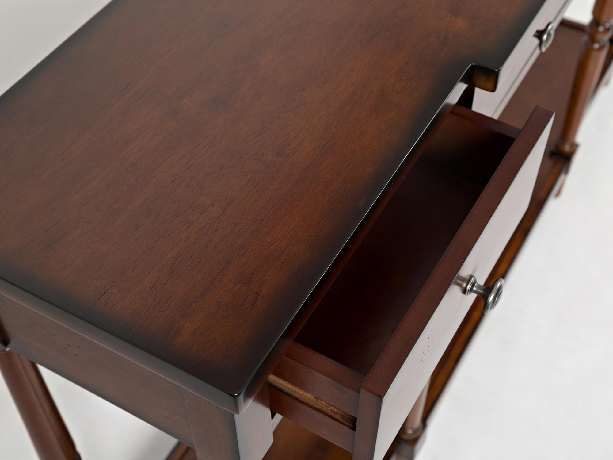 Elegancka konsola w stylu Hampton, która łączy funkcjonalność z unikalnym designem. Wykonana z drewna kauczukowca, wyróżnia się subtelnymi, ale charakterystycznymi postarzeniami w postaci kornikowania na blacie, półce i frontach. Stylowe toczone nóżki oraz prostokątne uchwyty dodają jej klasycznego charakteru, a praktyczne szuflady i półka oferują dodatkową przestrzeń do przechowywania. Kolor antycznego mahoniu w połączeniu z postarzanymi detalami sprawia, że mebel idealnie pasuje do wnętrz w stylu rustykalnym, vintage czy Hampton.