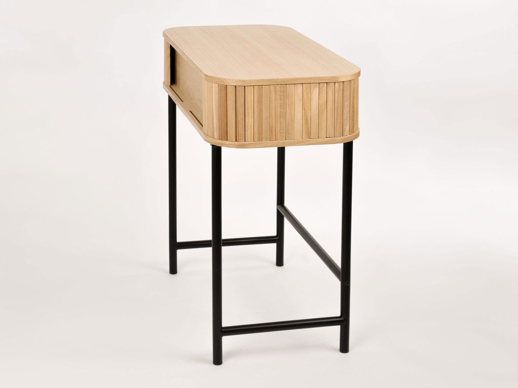 Konsola drewniana w stylu skandynawskim z pionowymi frezami i czarną metalową podstawą
