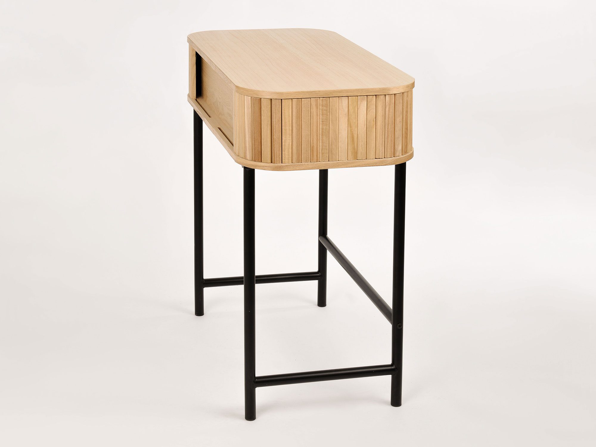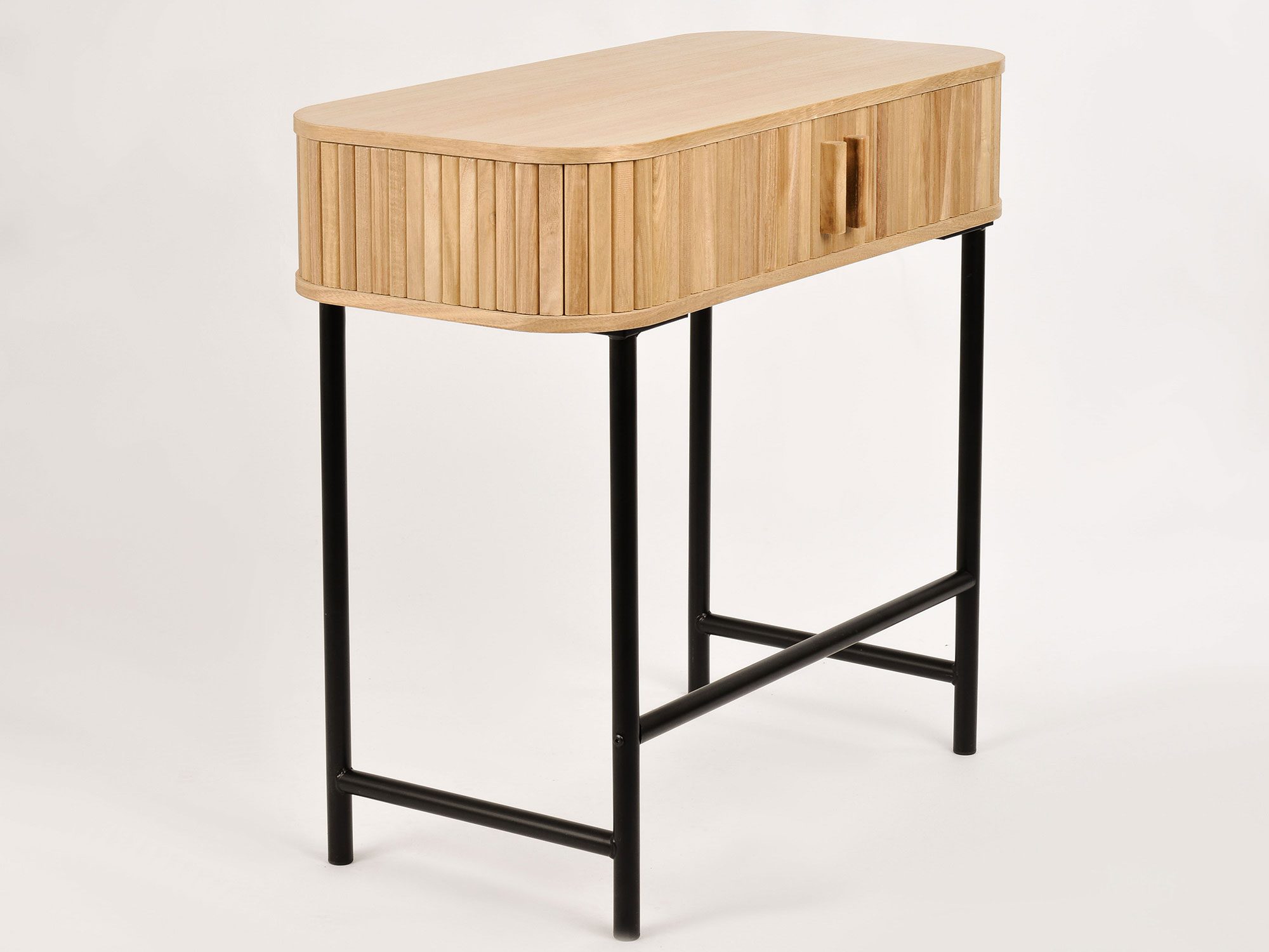 Konsola Florence zachwyca prostotą i elegancją. Wysokiej jakości drewno paulowni zapewnia trwałość i subtelny, ciepły wygląd, podczas gdy metalowe nogi dodają jej nowoczesnego, industrialnego charakteru. Przesuwne drzwi z listewek oferują łatwy dostęp do wnętrza mebla, jednocześnie stanowiąc atrakcyjny element wizualny.