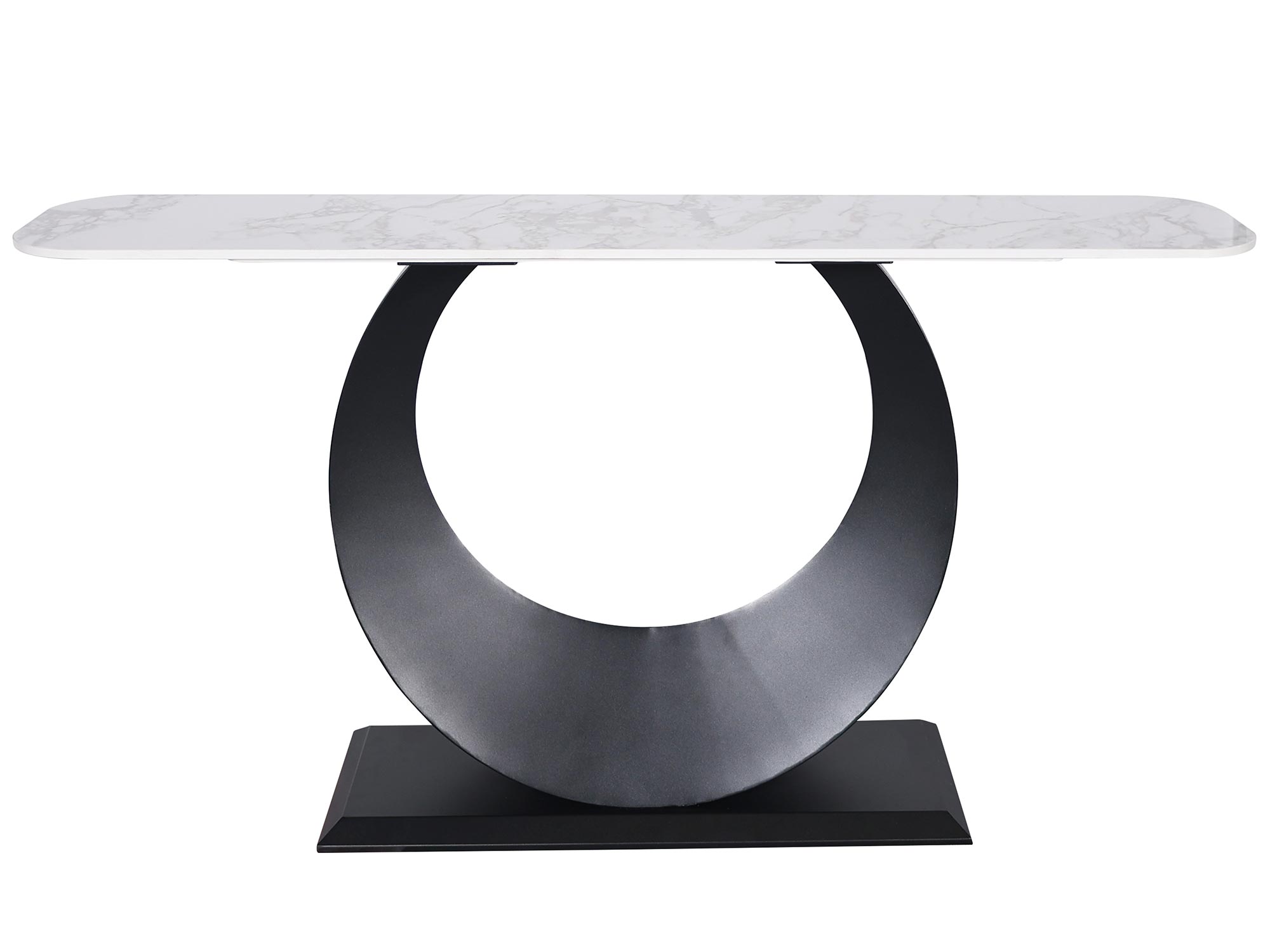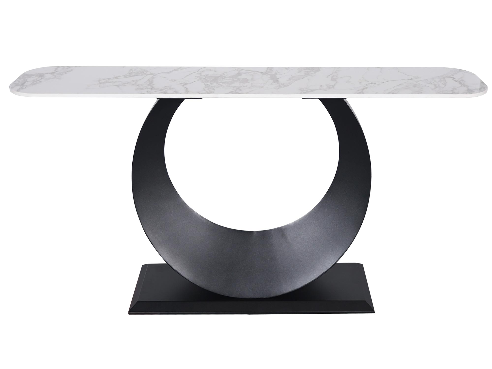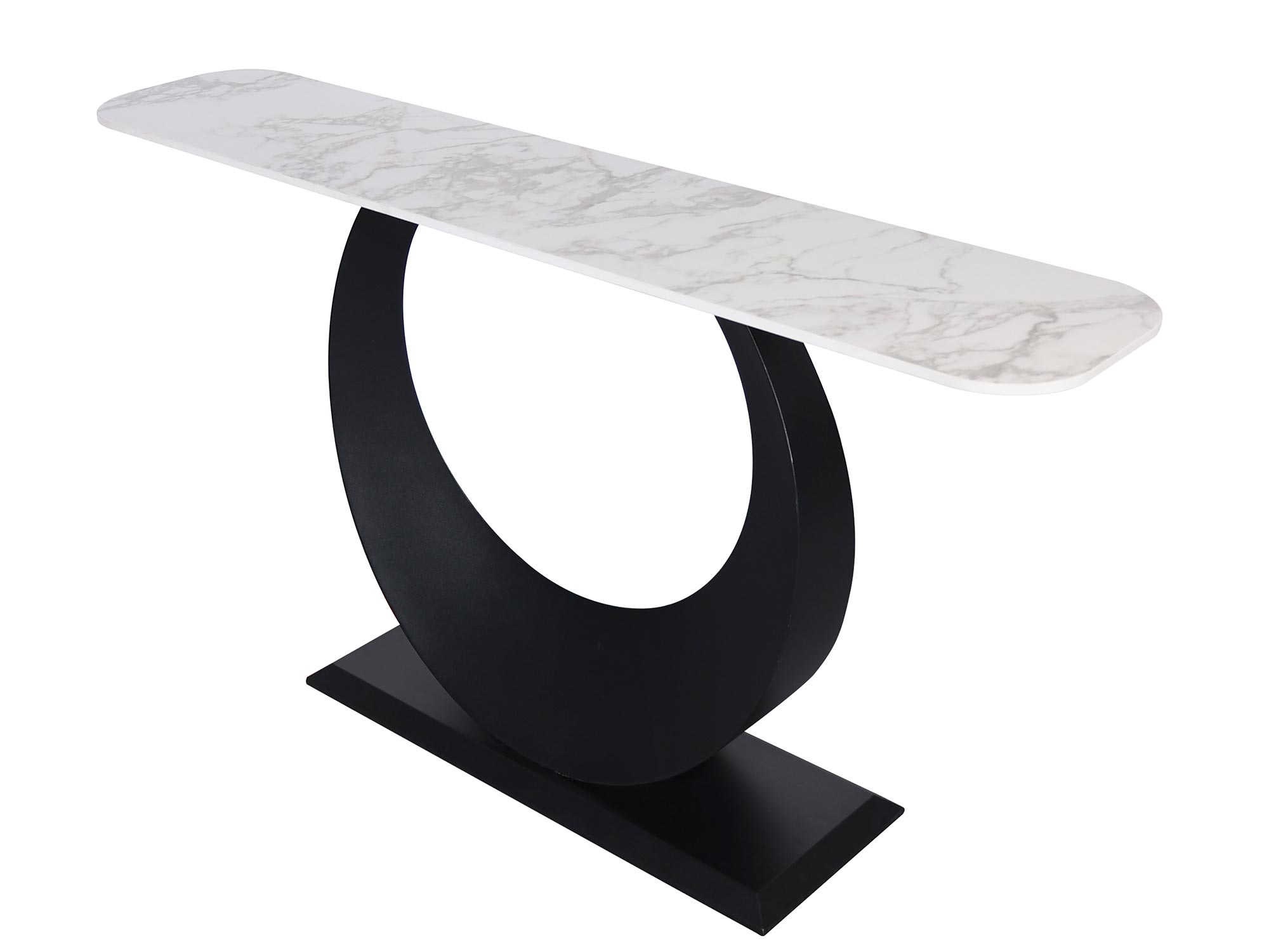Ta nietuzinkowa konsola została stworzona z żelaza w kolorze czarnym, co zapewnia jej wytrzymałość i stabilność. Blat imitujący marmur o białym kolorze jest elegancki i subtelny, nadając konsoli niepowtarzalny charakter. Konstrukcja przypominająca księżyc osadzony na prostokątnej podstawie z zaokrąglonymi brzegami sprawia, że produkt jest wyjątkowy. To połączenie klasyki i nowoczesności, które zachwyci każdego miłośnika eleganckich mebli.