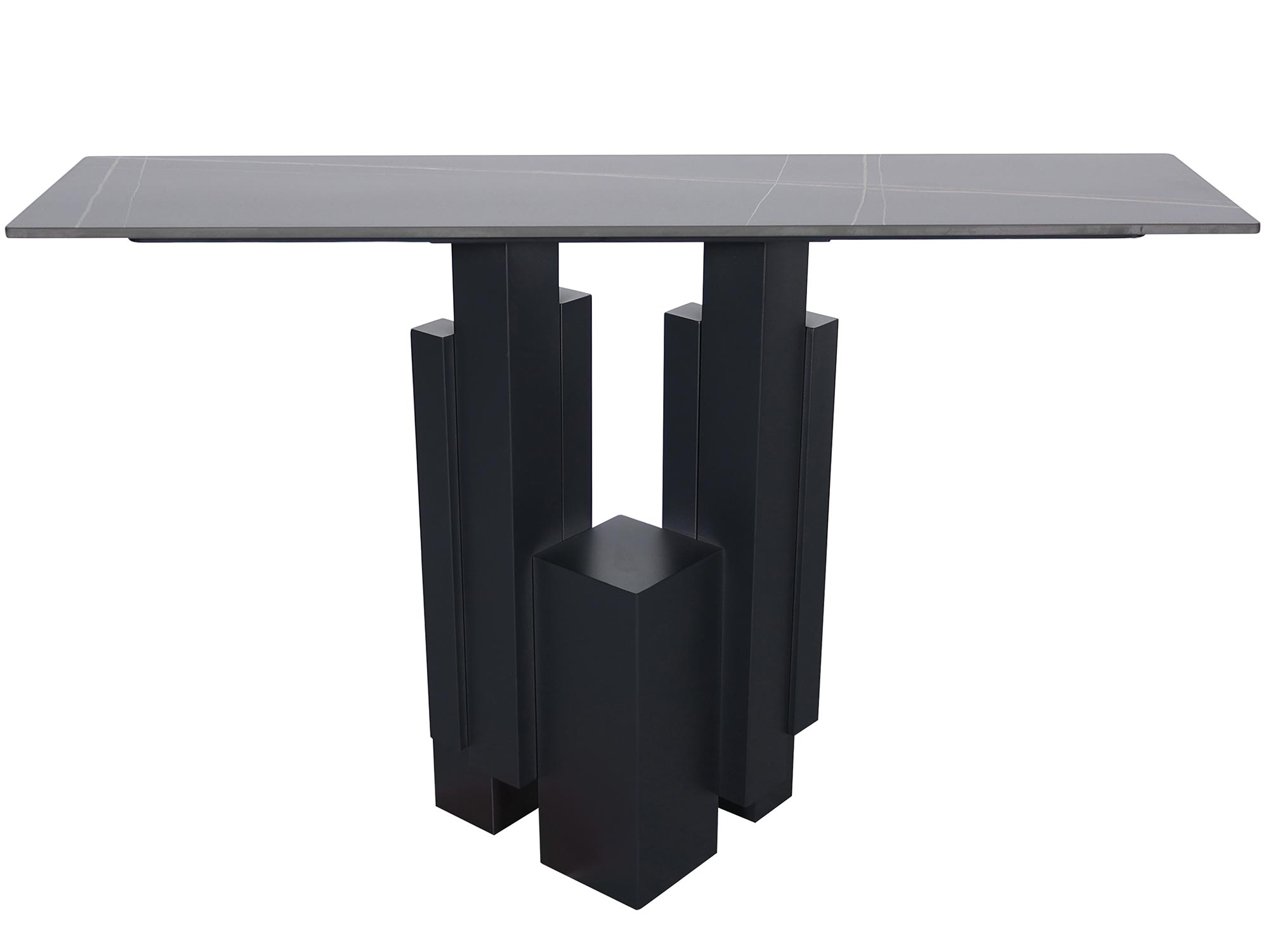 Konsola Virtus to połączenie solidnej stali węglowej oraz wysokiej jakości spiekanego kamienia, który imituje marmur. Charakterystyczna geometria nogi w kształcie przestrzennej bryły o ostrych krawędziach przyciąga wzrok i nadaje meblowi wyjątkowej nowoczesności. Blat imitujący marmur charakteryzuje się eleganckim wykończeniem, które nadaje całości stylowego, luksusowego wyglądu. Produkt ten nie tylko wprowadza elegancję do wnętrz, ale również gwarantuje trwałość i niezawodność na lata.