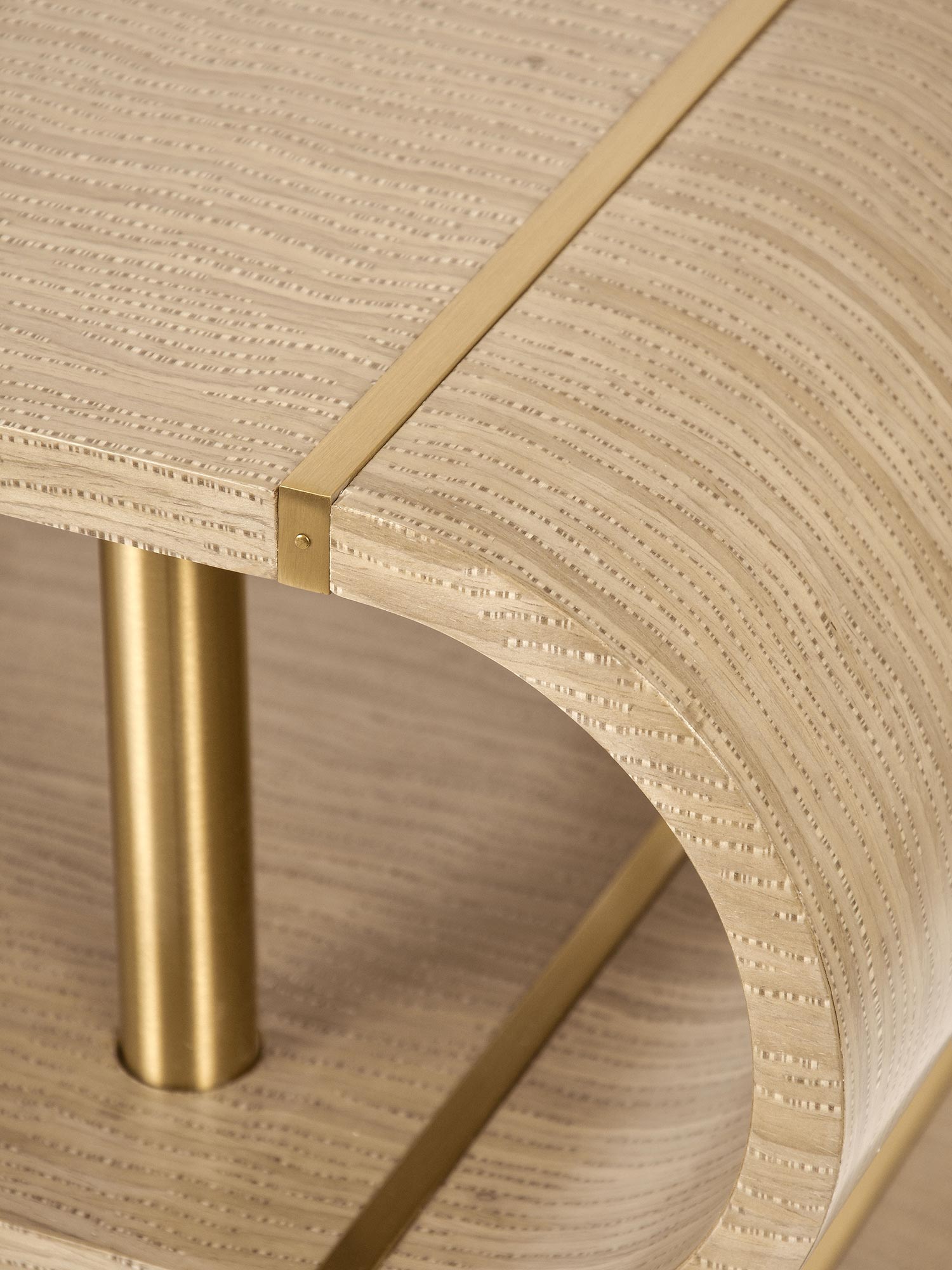 Konsola Eleganza to mebel, który łączy w sobie nowoczesność i elegancję. Jej subtelny szary kolor doskonale komponuje się z złotymi nogami, tworząc efektowny kontrast. Korpus konsoli pokryty jest okleiną o widocznej strukturze drewna, co dodaje jej naturalnego uroku. Unikalny, sinusoidalny kształt półek sprawia, że konsola wyróżnia się na tle innych modeli, oferując nie tylko funkcjonalność, ale także estetyczną przyjemność.