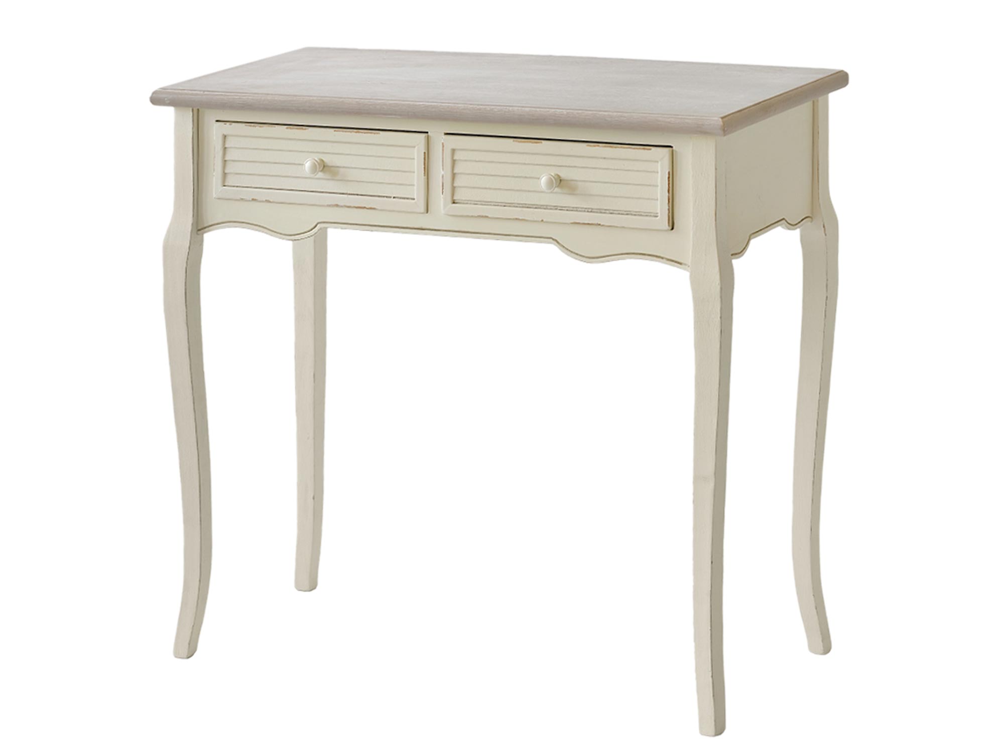 Elegancka i funkcjonalna konsola w stylu prowansalskim, która doskonale wkomponuje się w romantyczne i klasyczne wnętrza. Wykonana z drewna paulowni, ręcznie malowana w kolorze kremowym, z subtelnymi przetarciami, dzięki czemu zyskuje unikalny charakter. Z giętymi nogami i metalowymi uchwytami w kształcie muszli, ten mebel łączy estetykę z praktycznością, oferując przestronną szufladę do przechowywania drobnych przedmiotów. Blat w odcieniu jasnobrązowym dodaje lekkości i elegancji.
