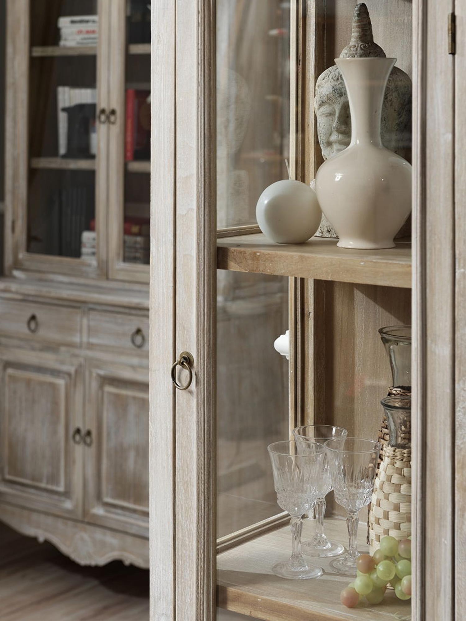 Kredens Viva to mebel, który łączy klasyczny design z funkcjonalnością. Wykonany z wysokiej jakości drewna paulowni, które zostało starannie bielone i szczotkowane, nadaje meblowi lekkość i wyjątkowy charakter. Jasnobrązowy kolor doskonale komponuje się z resztą mebla, a subtelne przetarcia nadają mu styl vintage. Metalowe uchwyty w kształcie gałek oraz delikatne rzeźbienia na frontach szuflad i drzwi nadają kredensowi elegancki wygląd. Gięte nóżki stanowią eleganckie wykończenie, a zarazem zapewniają stabilność. Kredens idealnie sprawdzi się zarówno w jadalni, jak i w salonie, gdzie będzie pełnił funkcję praktyczną oraz dekoracyjną.