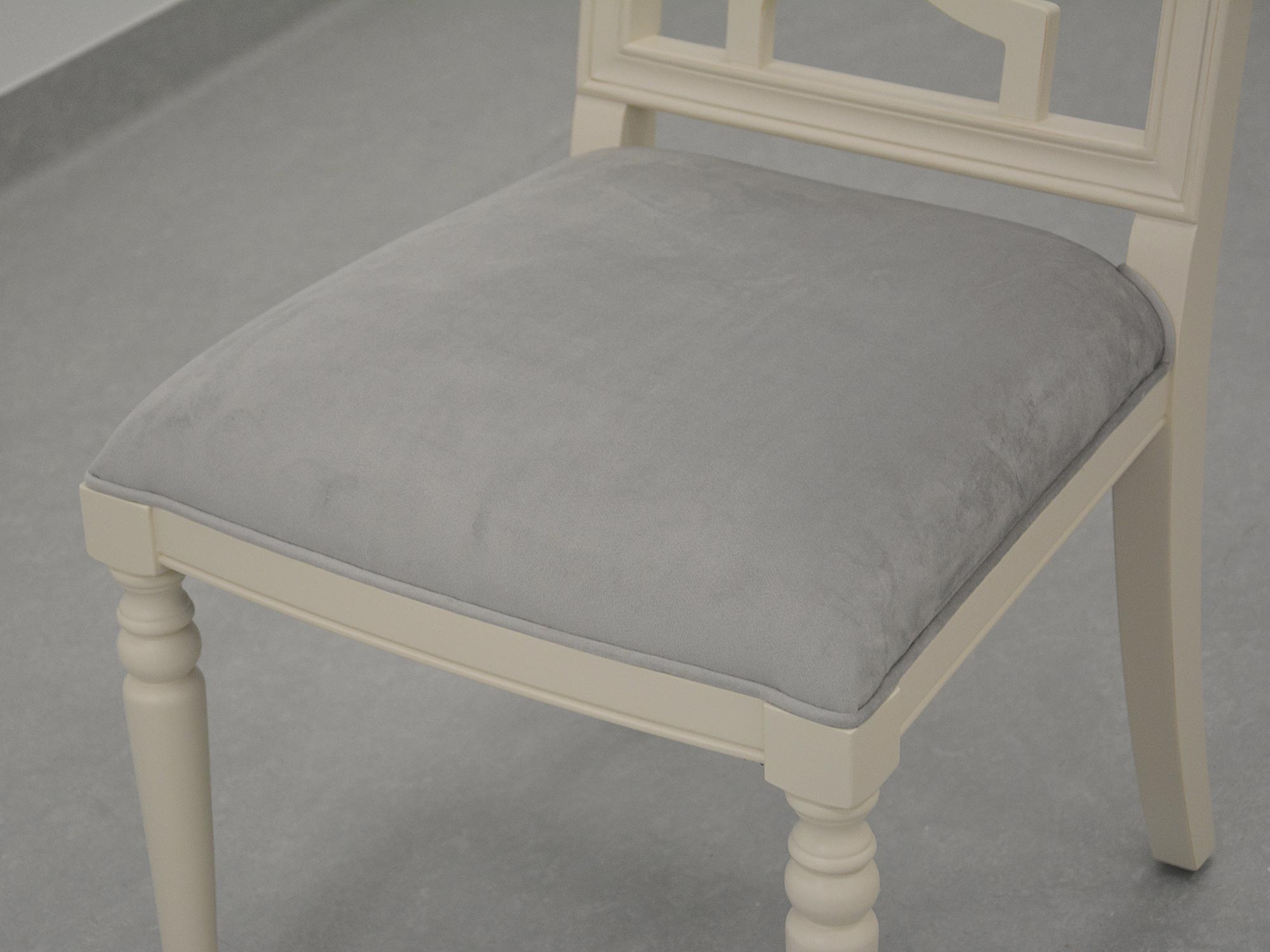 Krzesło tapicerowane na toczonych nóżkach, wykonane z drewna brzozy, to mebel, który charakteryzuje się nie tylko solidnością, ale i pięknym, klasycznym designem. Jego subtelny wygląd w bieli antycznej doskonale pasuje do wnętrz w stylu prowansalskim. Aksamitna tkanina w kolorze szarym oraz delikatne ażurowe plecy nadają mu elegancji, tworząc wyjątkowy element dekoracyjny. Staranne wykonanie oraz wysokiej jakości materiały sprawiają, że to krzesło jest wygodne i trwałe, stanowiąc doskonały wybór do długoterminowego użytkowania.