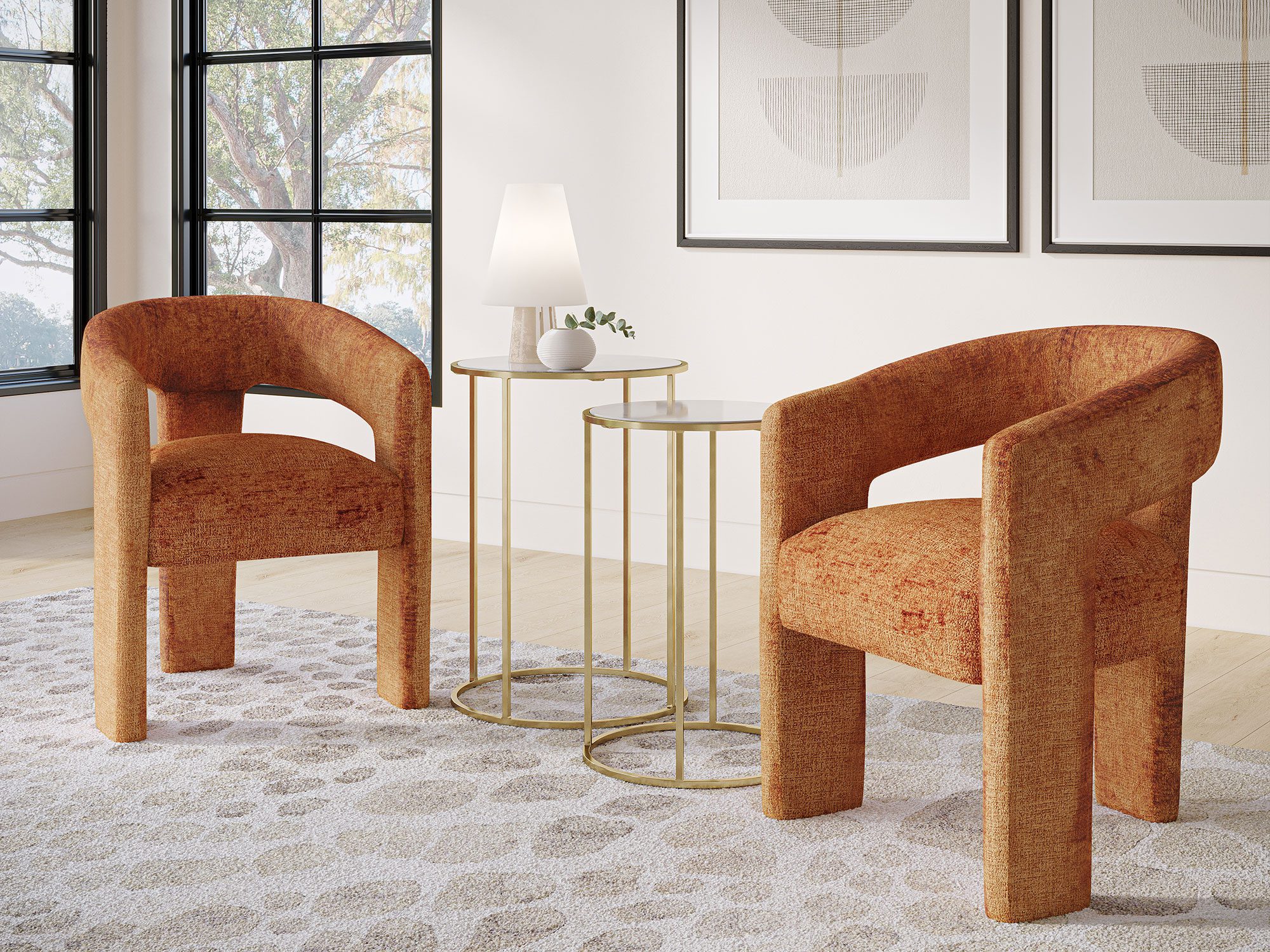 Zestaw dwóch pomarańczowych krzeseł tapicerowanych z okrągłym stolikiem w aranżacji salonu
