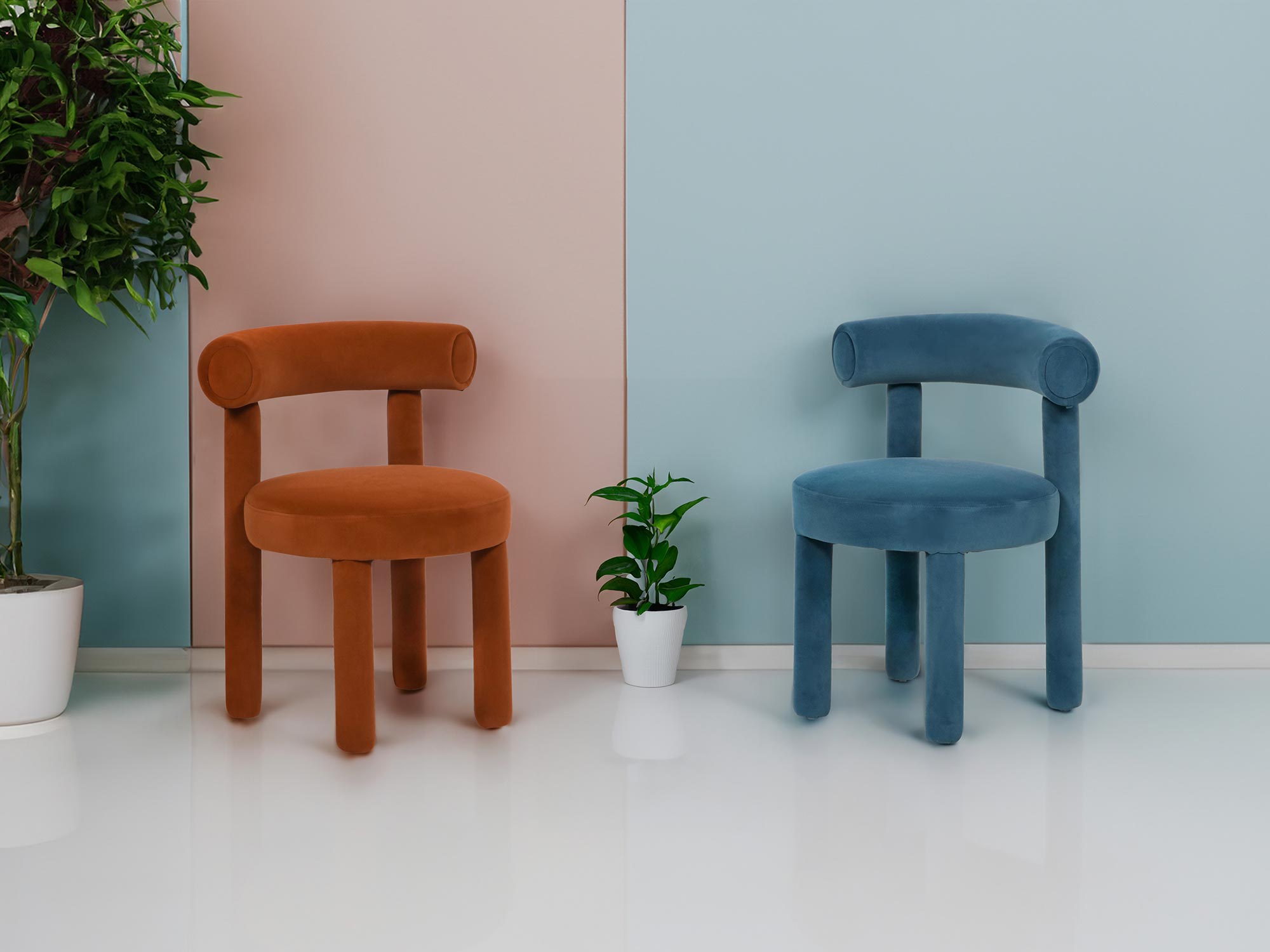 Krzesła w kolorze terakoty i szafirowym, nowoczesna aranżacja wnętrza