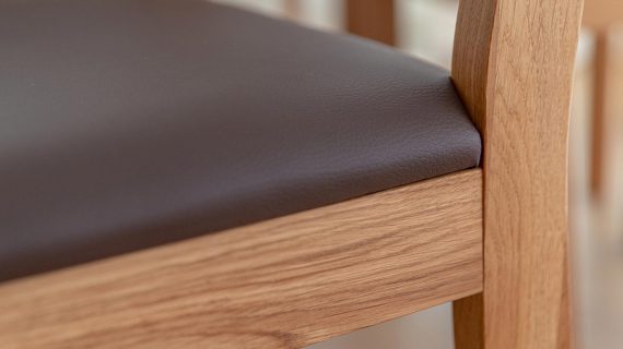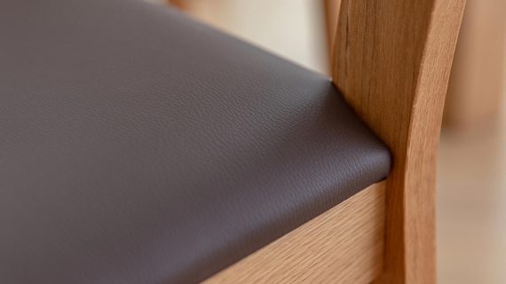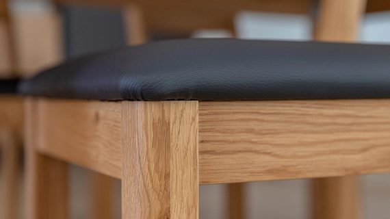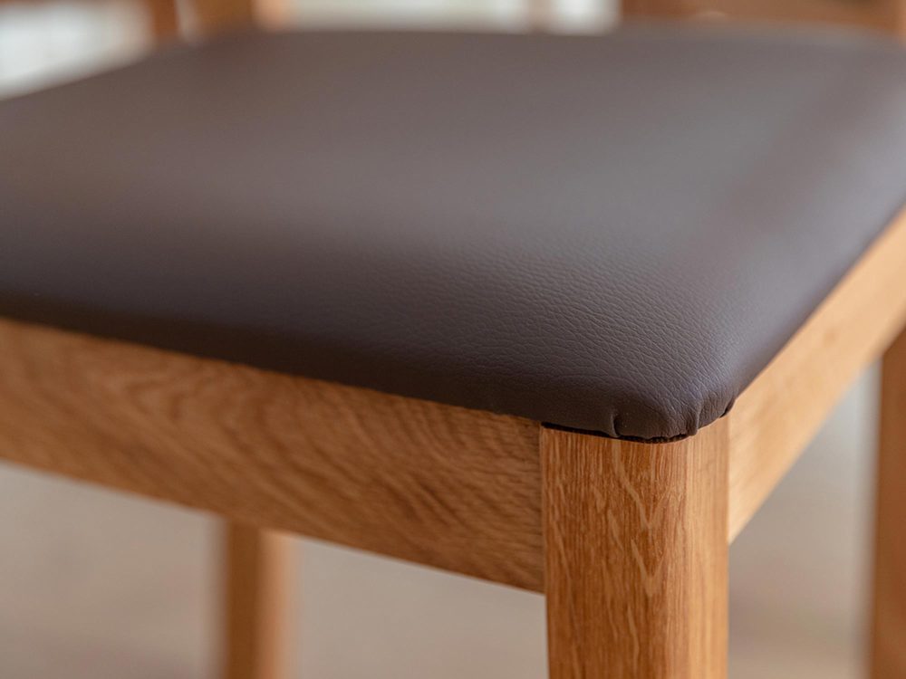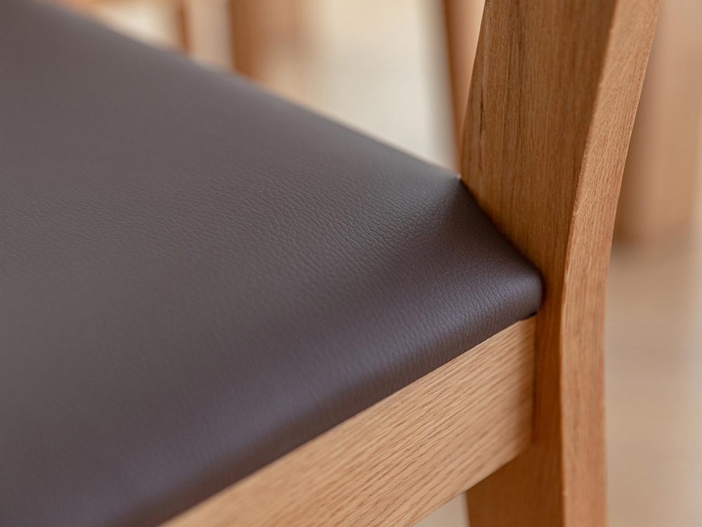 Miękkie siedzisko pokryte ekoskórą zapewnia wygodę nawet podczas dłuższego siedzenia. Ekoskóra jest gładka, łatwa w pielęgnacji i świetnie prezentuje się w zestawieniu z naturalnym kolorem drewna. To rozwiązanie, które sprawdzi się przy stole w kuchni, w jadalni, a także w salonie – wszędzie tam, gdzie liczy się i komfort, i estetyka. Proporcje siedziska i oparcia zaprojektowano tak, by zapewnić pewne podparcie i wygodę przy stole czy podczas pracy z laptopem.