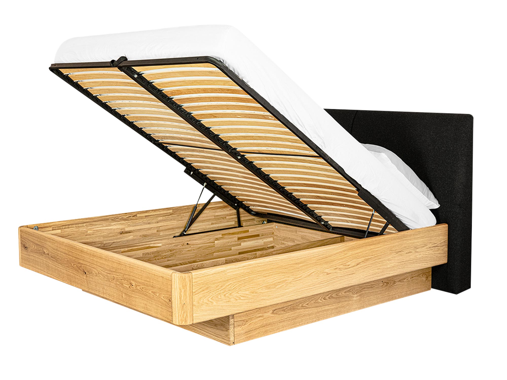 Dębowe łóżko z podnoszonym stelażem i pojemnikiem Bamare