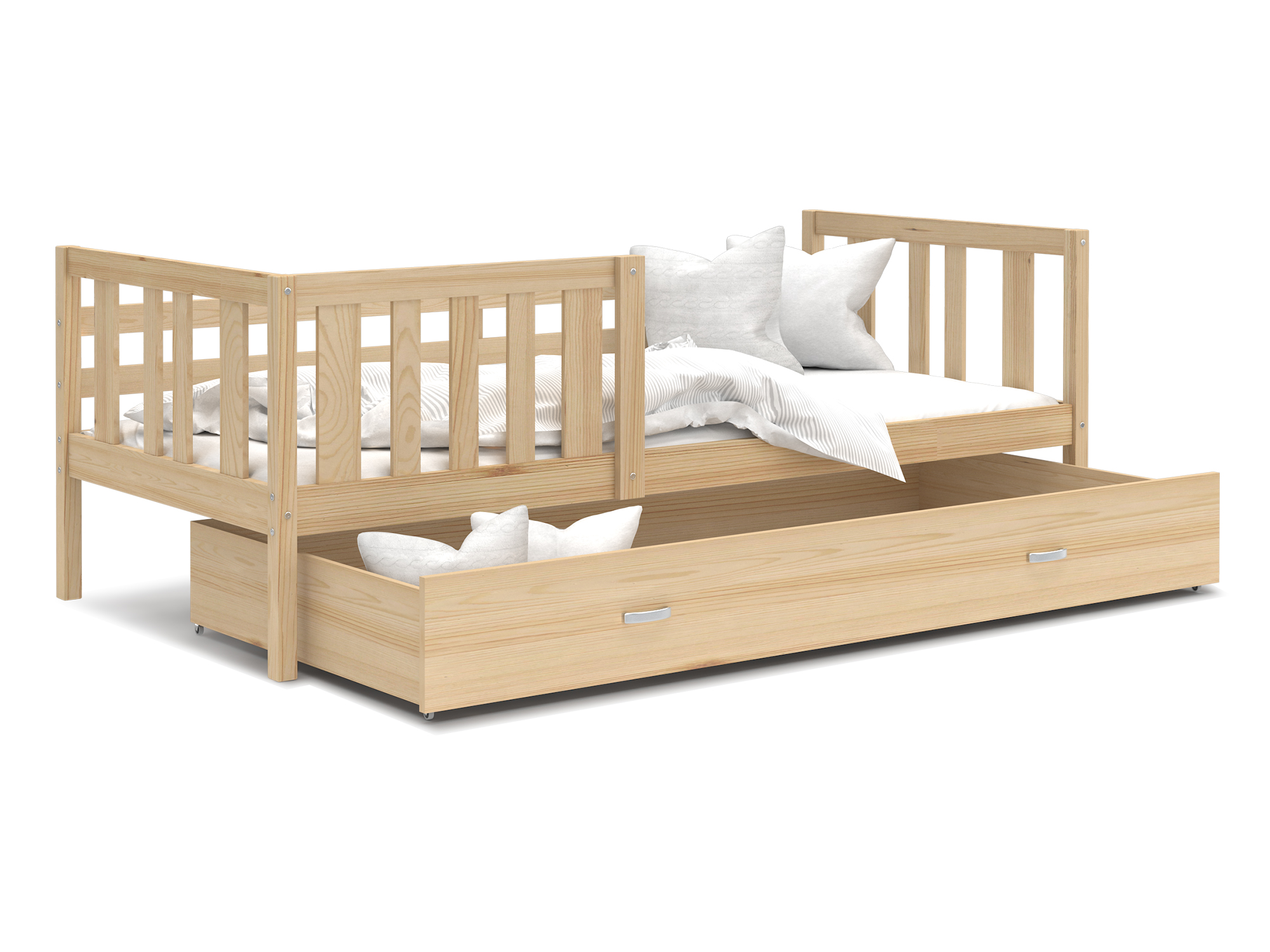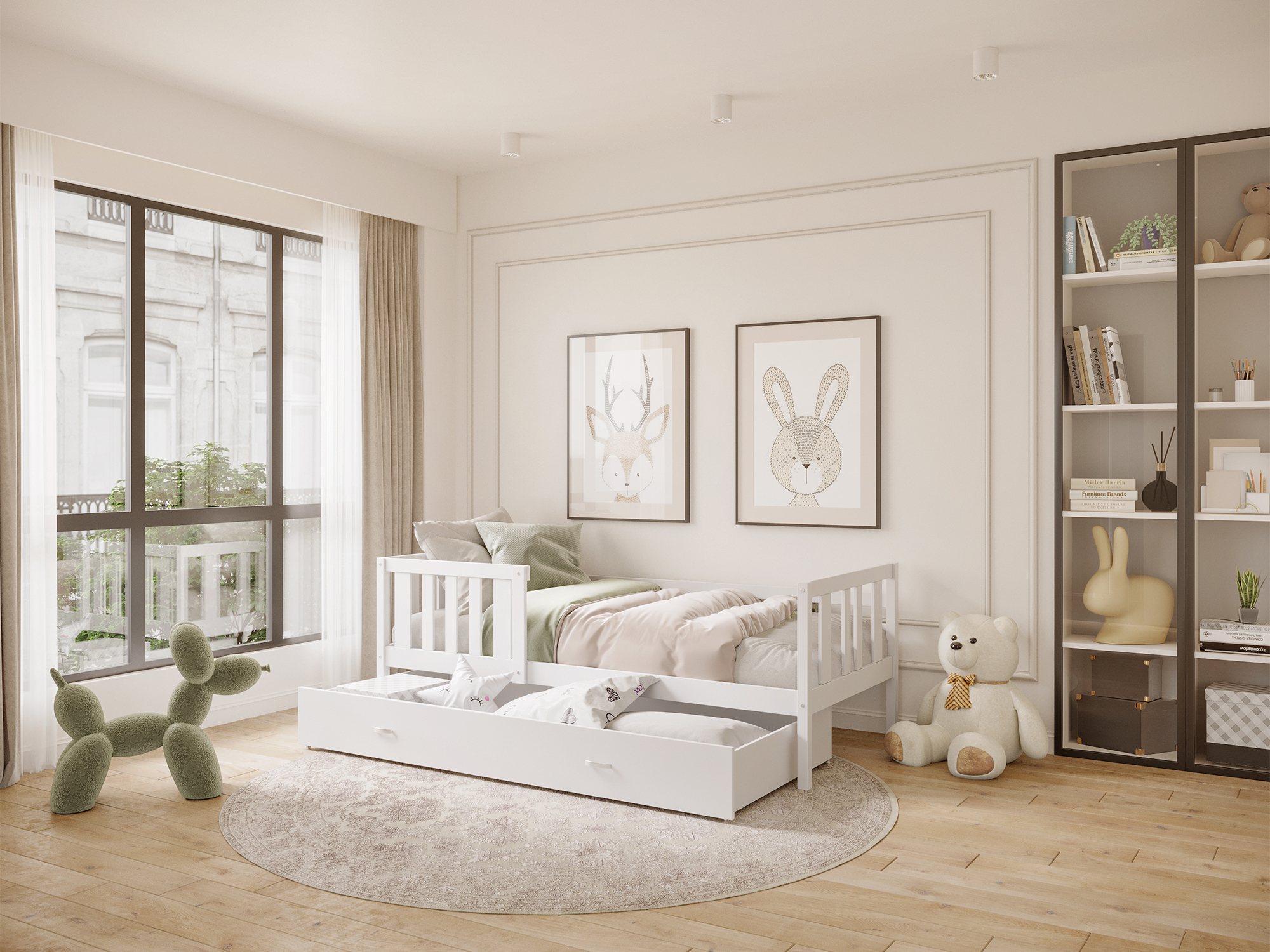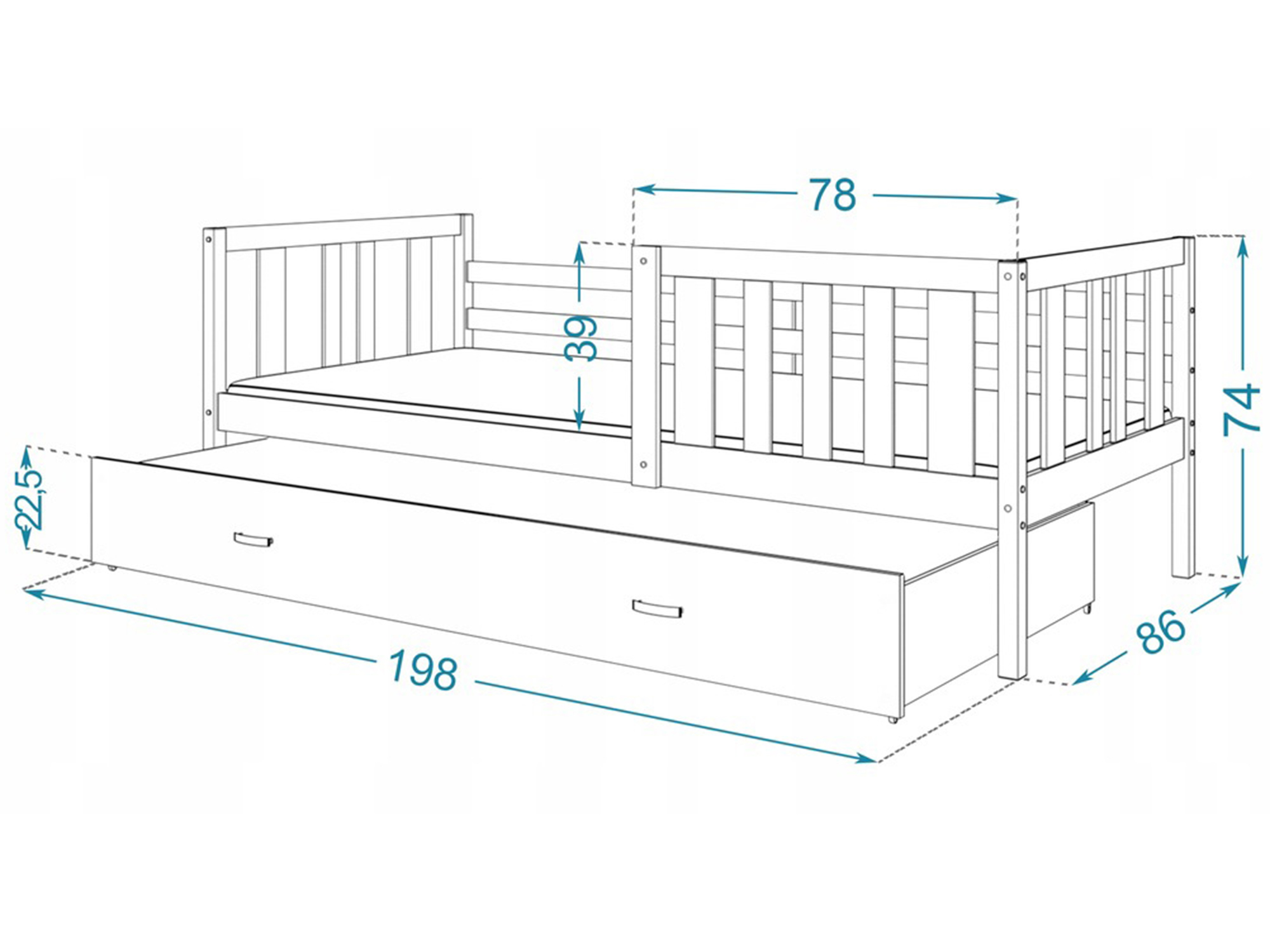 Dodatkowym atutem jest wysuwana szuflada, w której ukryto dodatkowe posłanie. To praktyczne rozwiązanie sprawdza się nie tylko w przypadku rodzeństwa, ale także podczas nocowania przyjaciół dziecka. Łóżko jest sprzedawane w zestawie z materacami piankowymi BERGAMO, co oznacza, że otrzymujesz kompletny zestaw gotowy do użytku od razu po montażu.
