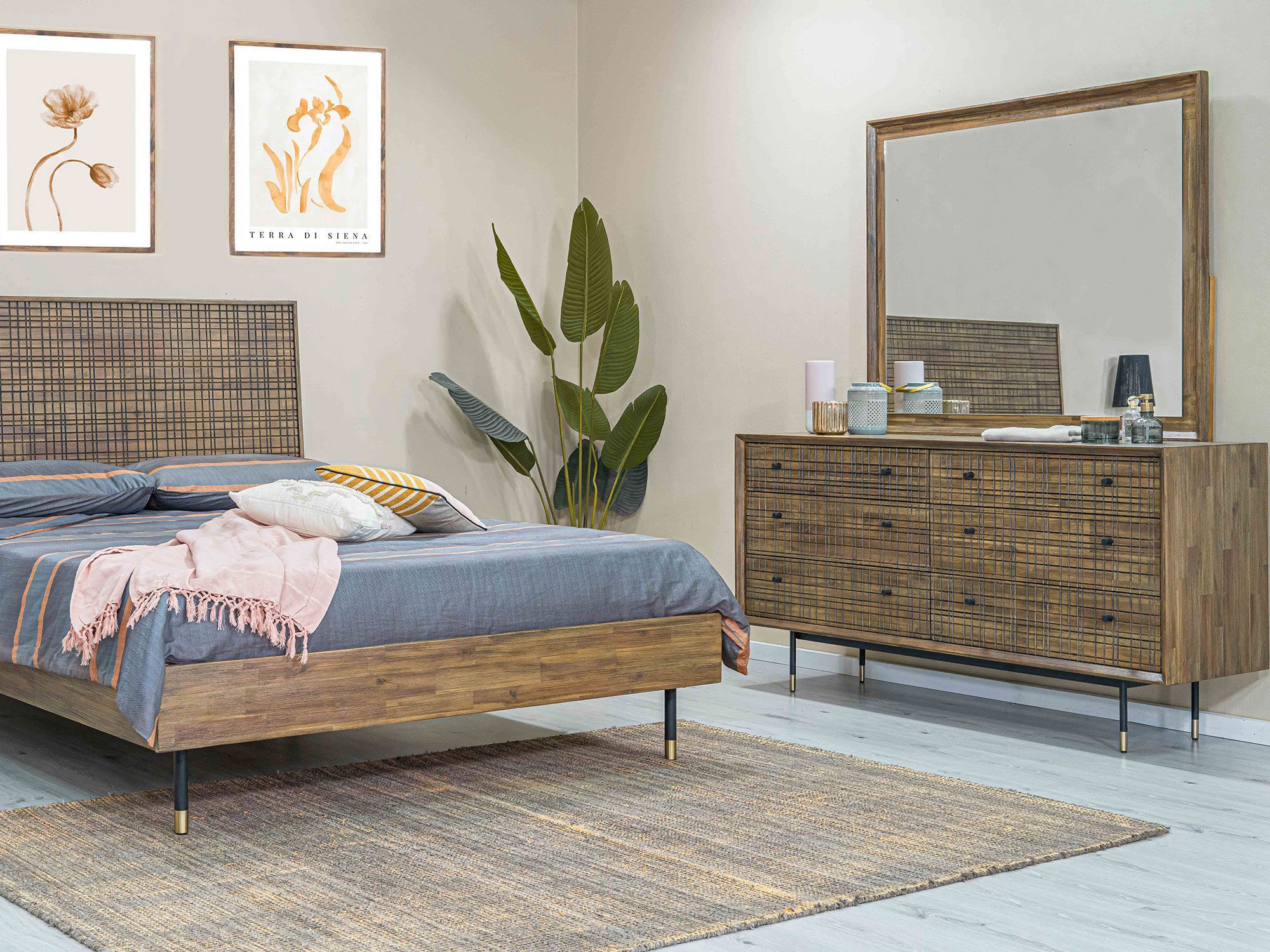 Łóżko Enigma to elegancka opcja dla osób, które szukają wyjątkowego mebla do swojej sypialni. Wykonane z wysokiej jakości drewna akacji egzotycznej i wyposażone w metalowe nogi zakończone złotymi akcentami, stanowi doskonały wybór do wnętrz w stylu retro lub nowoczesnym. Wezgłowie łóżka z strukturą 3D i brak stelaża pozwala na dostosowanie go do indywidualnych potrzeb. Wybierz łóżko Enigma, aby nadać swojej sypialni wyjątkowego charakteru i stylu.
