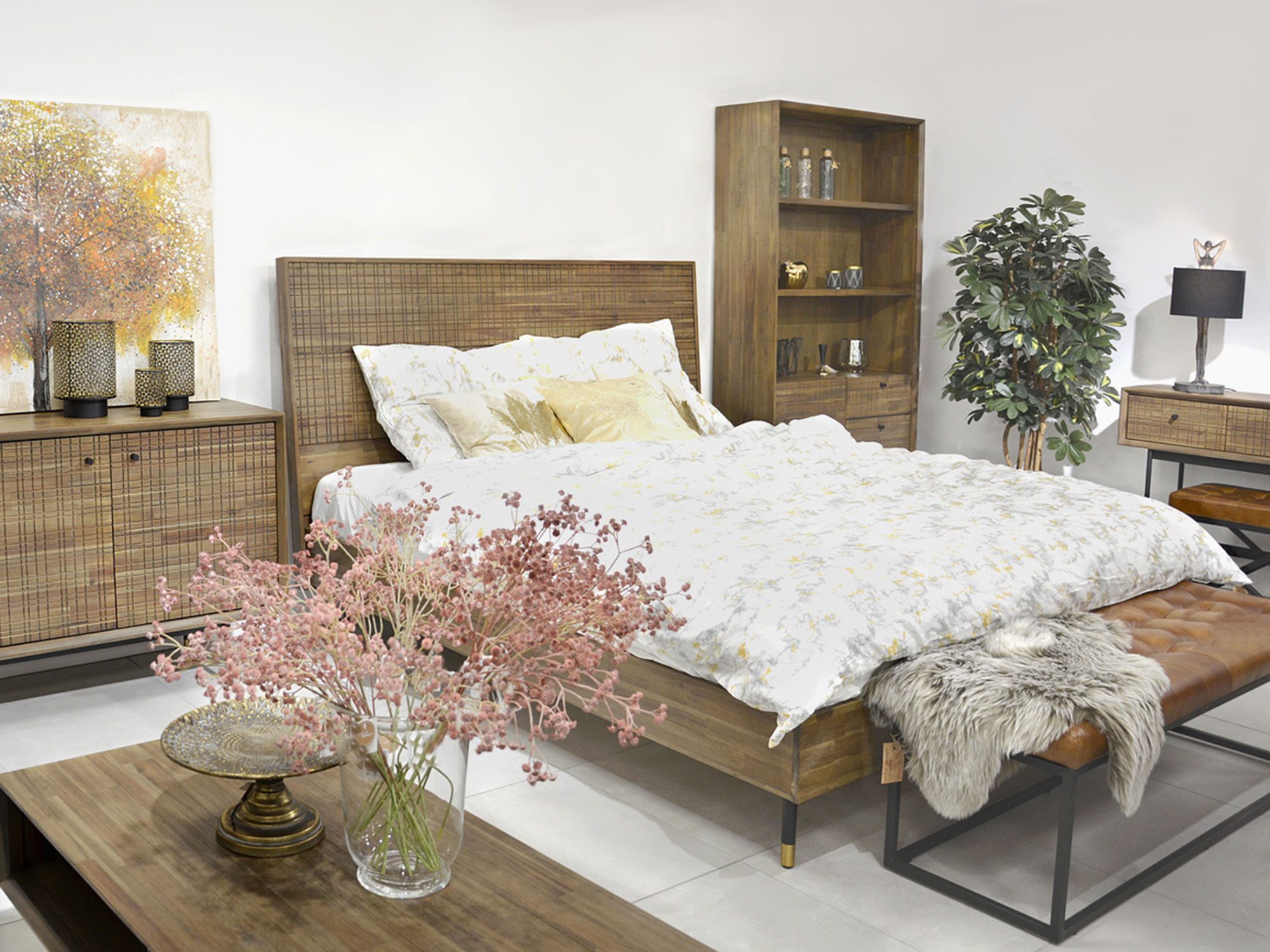 Łóżko dwuosobowe w stylu boho z plecionym zagłówkiem i drewnianą ramą