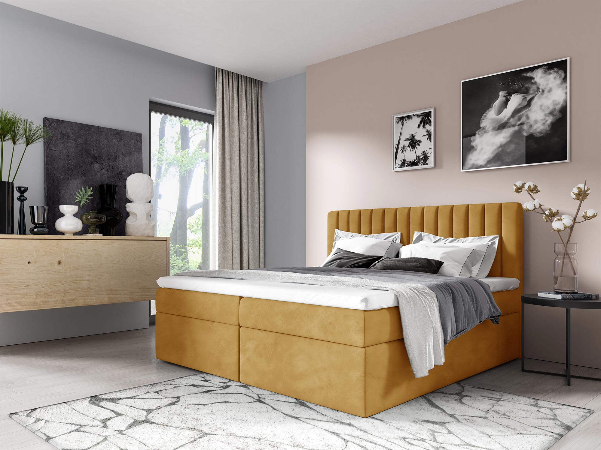 – Minimalistyczny styl – nisko osadzone łóżko bez widocznych nóżek wpisuje się w nowoczesne trendy wnętrzarskie.