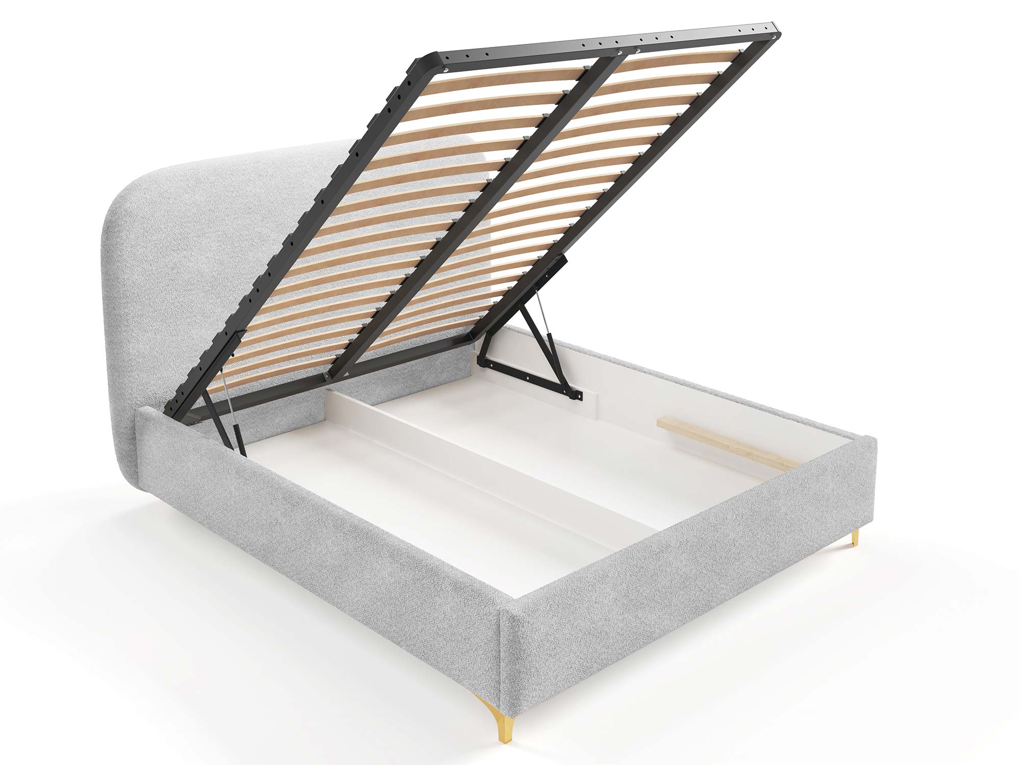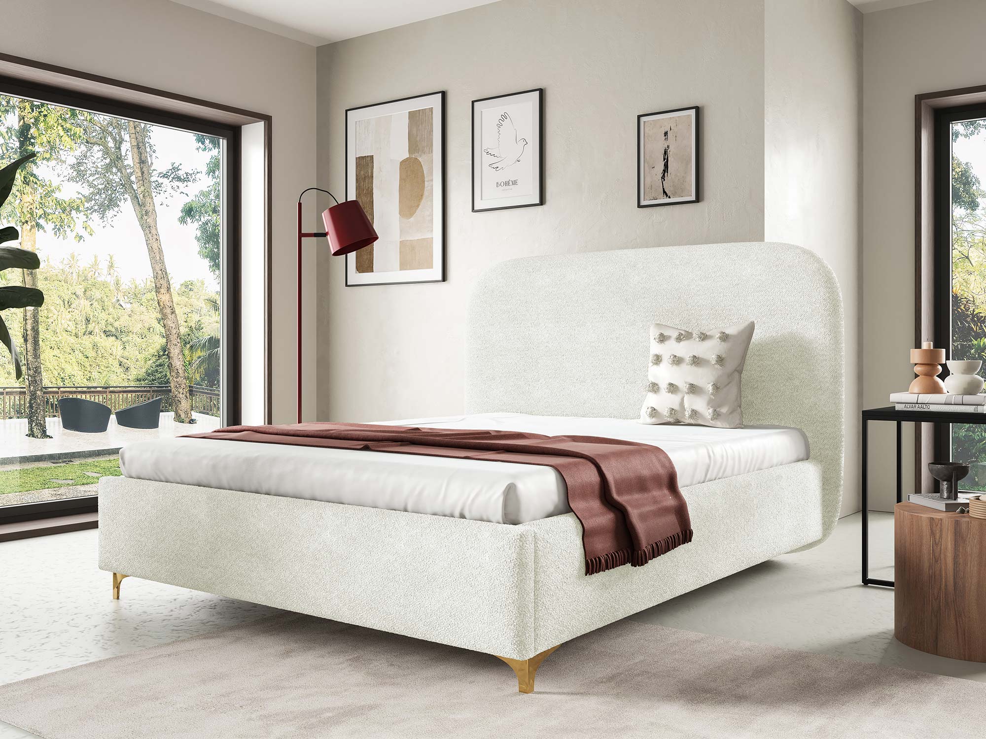 Wzrok przyciągają złote, metalowe nóżki, które dodają całości lekkości i elegancji. To detal, który potrafi odmienić charakter całego wnętrza, czyniąc z łóżka centralny punkt sypialni. Wysokie zagłowie o wysokości 124 cm nie tylko wygląda efektownie, ale także daje wygodne podparcie podczas czytania czy wieczornego relaksu.