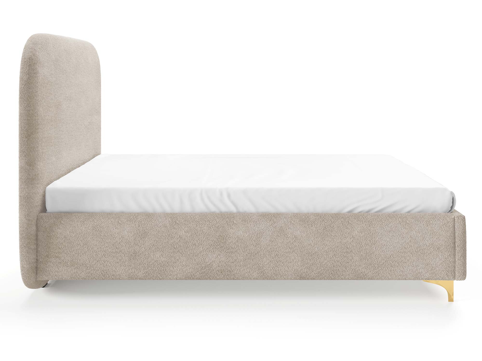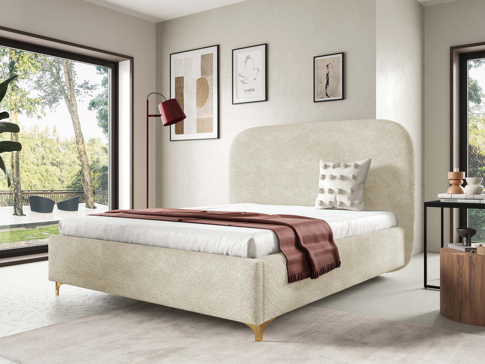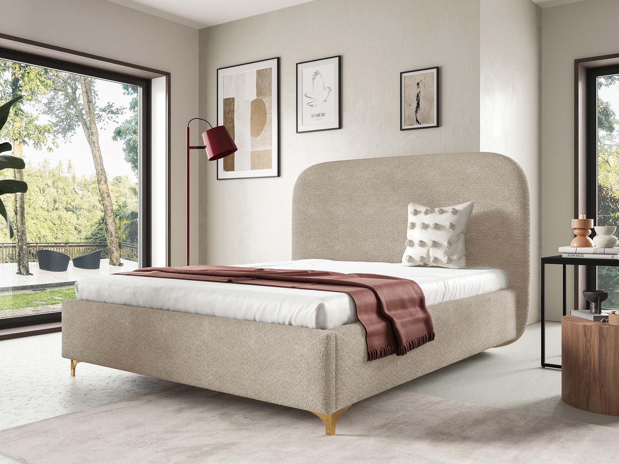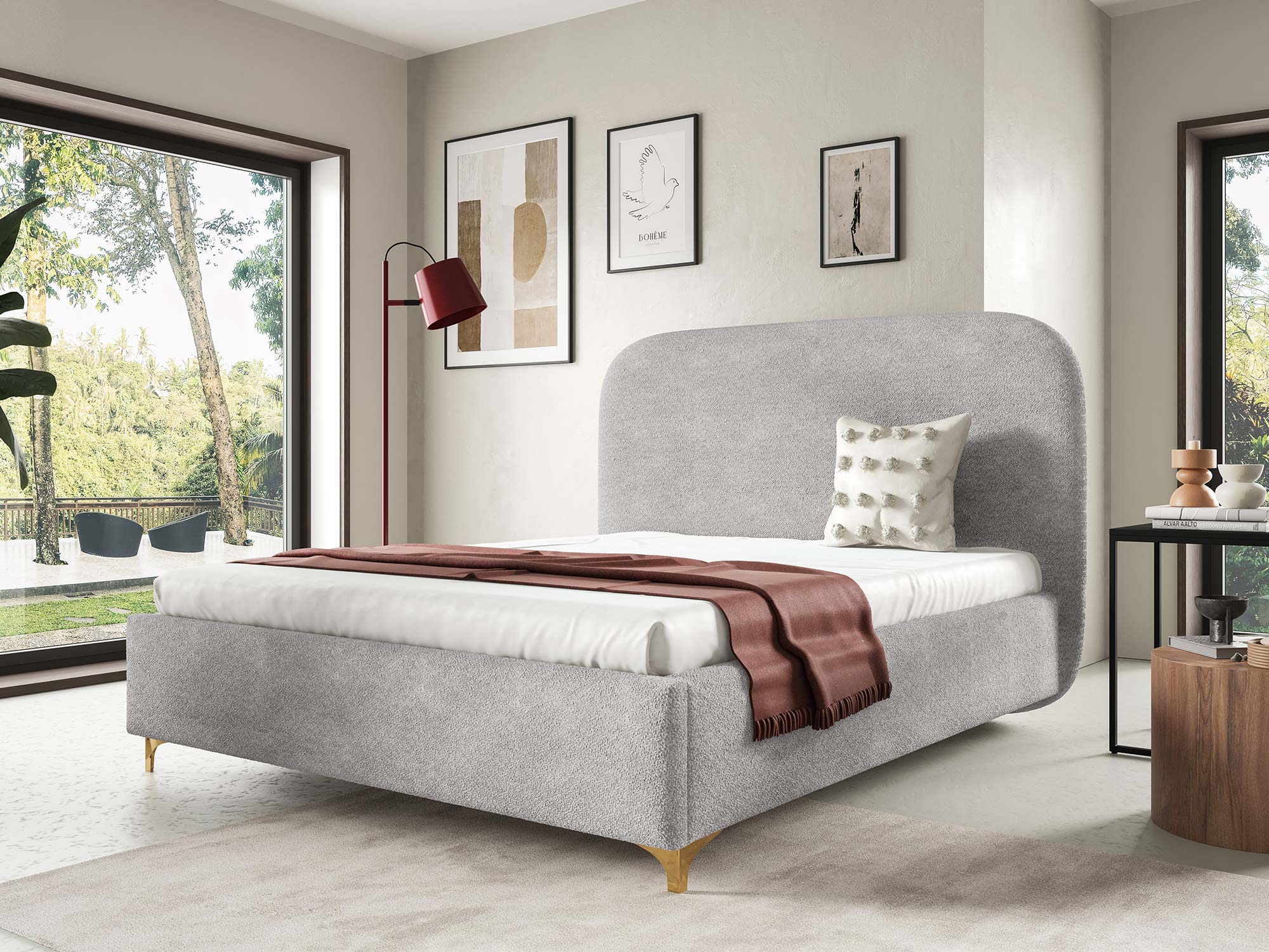 Wzrok przyciągają złote, metalowe nóżki, które dodają całości lekkości i elegancji. To detal, który potrafi odmienić charakter całego wnętrza, czyniąc z łóżka centralny punkt sypialni. Wysokie zagłowie o wysokości 124 cm nie tylko wygląda efektownie, ale także daje wygodne podparcie podczas czytania czy wieczornego relaksu.