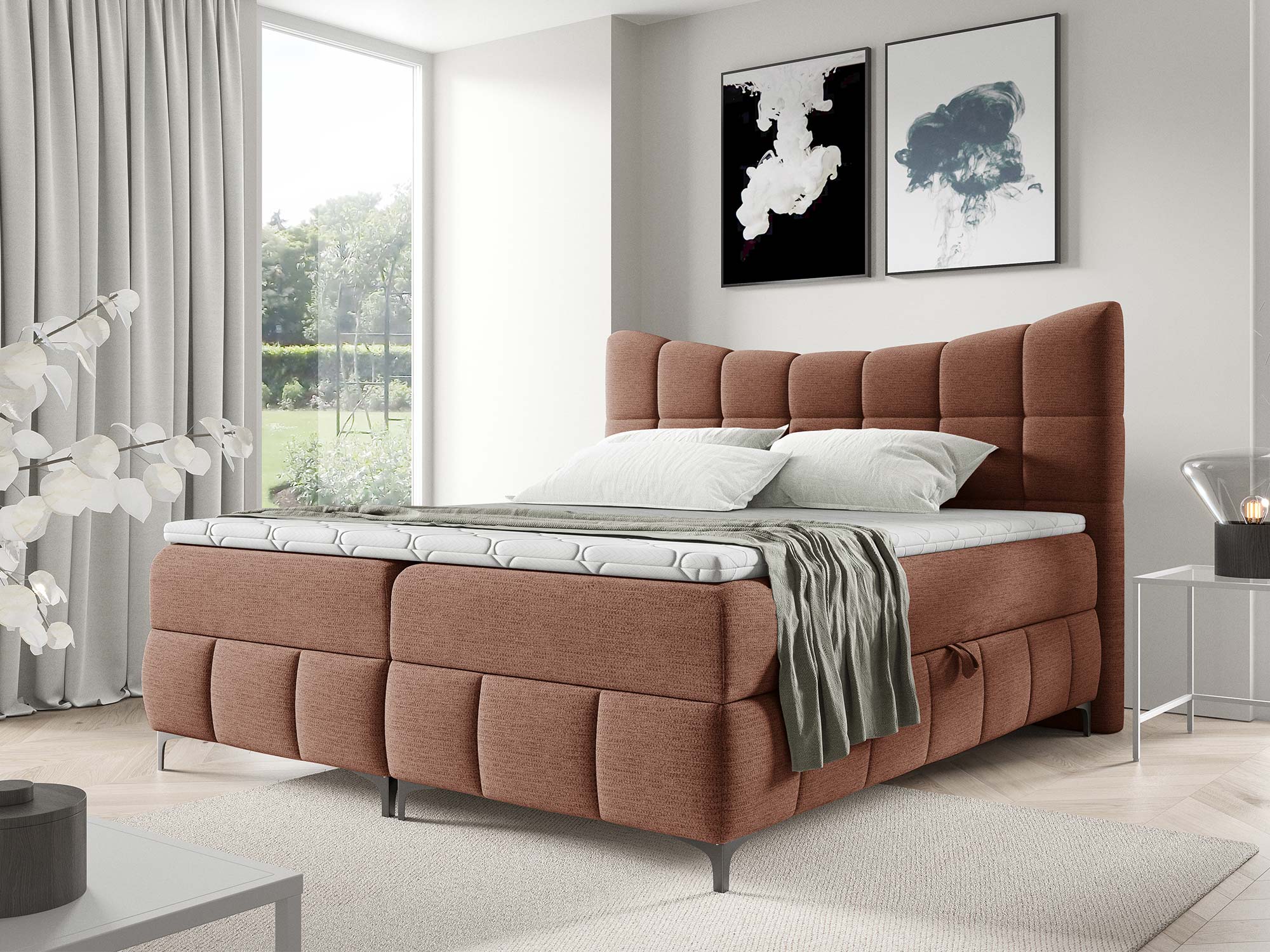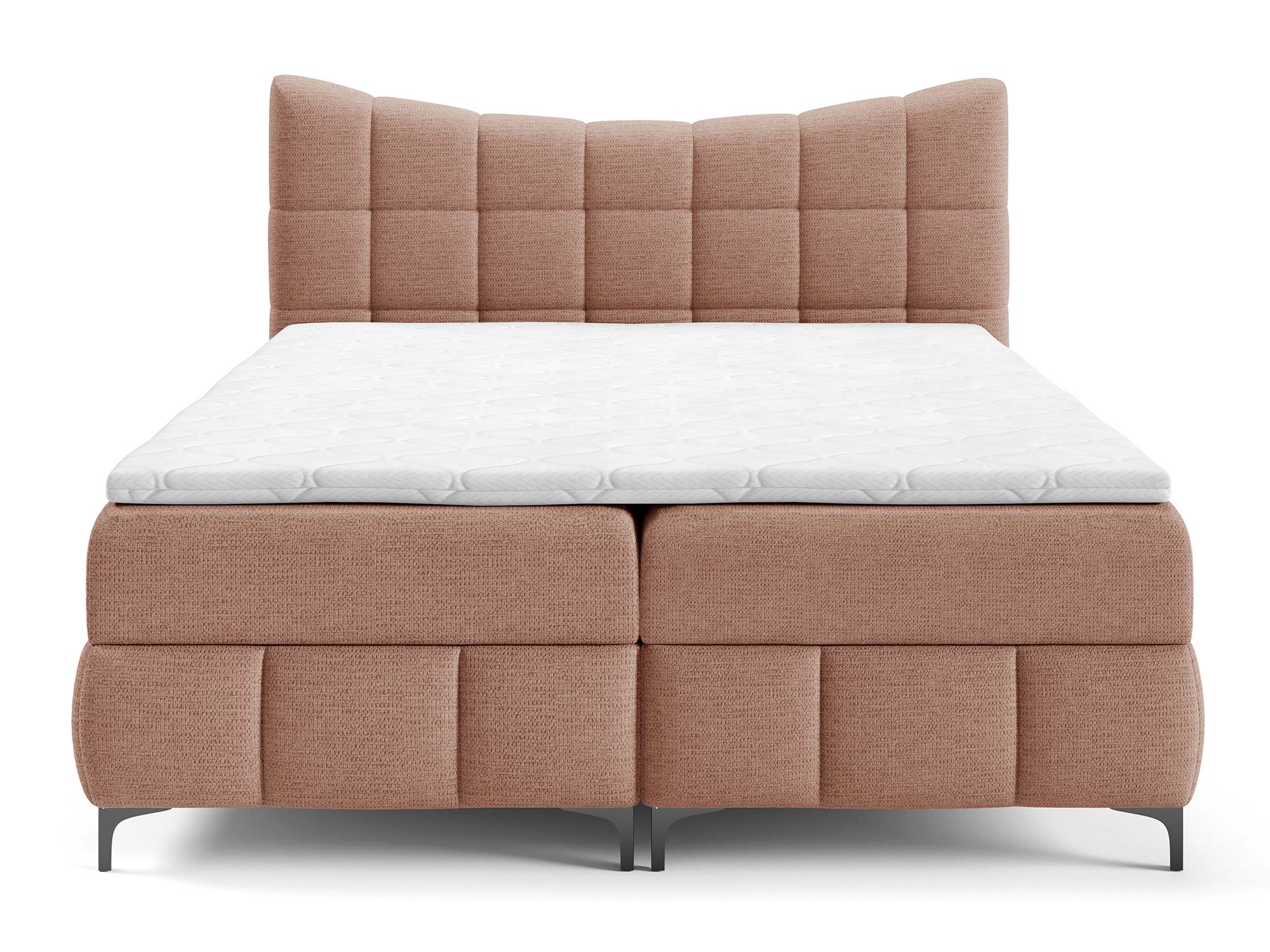 Materace częściowo obite tkaniną to nowoczesne rozwiązanie, które nadaje łóżku designerskiego charakteru. Zastosowany materac główny ze sprężynami bonellowymi zapewnia odpowiednie podparcie i równomierne rozłożenie ciężaru ciała. Dzięki dodatkowi toppera z pianki T-25 o wysokości 4 cm komfort snu wzrasta, a każdy poranek przynosi uczucie świeżości i wypoczynku.