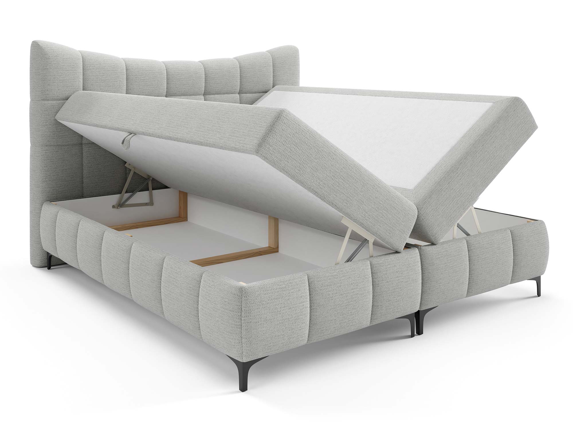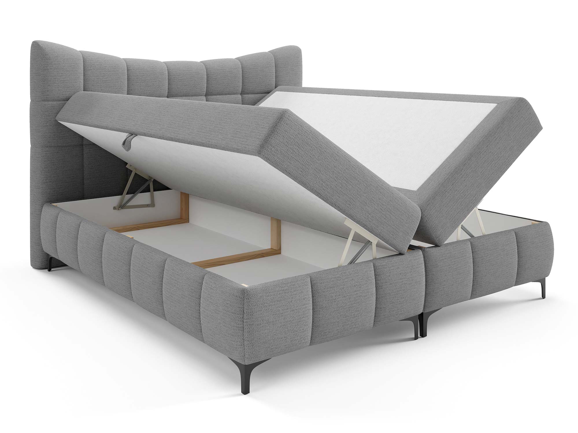 Ogromnym atutem są dwa pojemniki na pościel. Dzięki nim z łatwością przechowasz kołdry, poduszki, narzuty czy sezonowe tekstylia. Automat na sprężynach sprawia, że dostęp do tej przestrzeni jest szybki i bez wysiłku – wystarczy lekko unieść powierzchnię spania, aby odsłonić pojemne schowki.