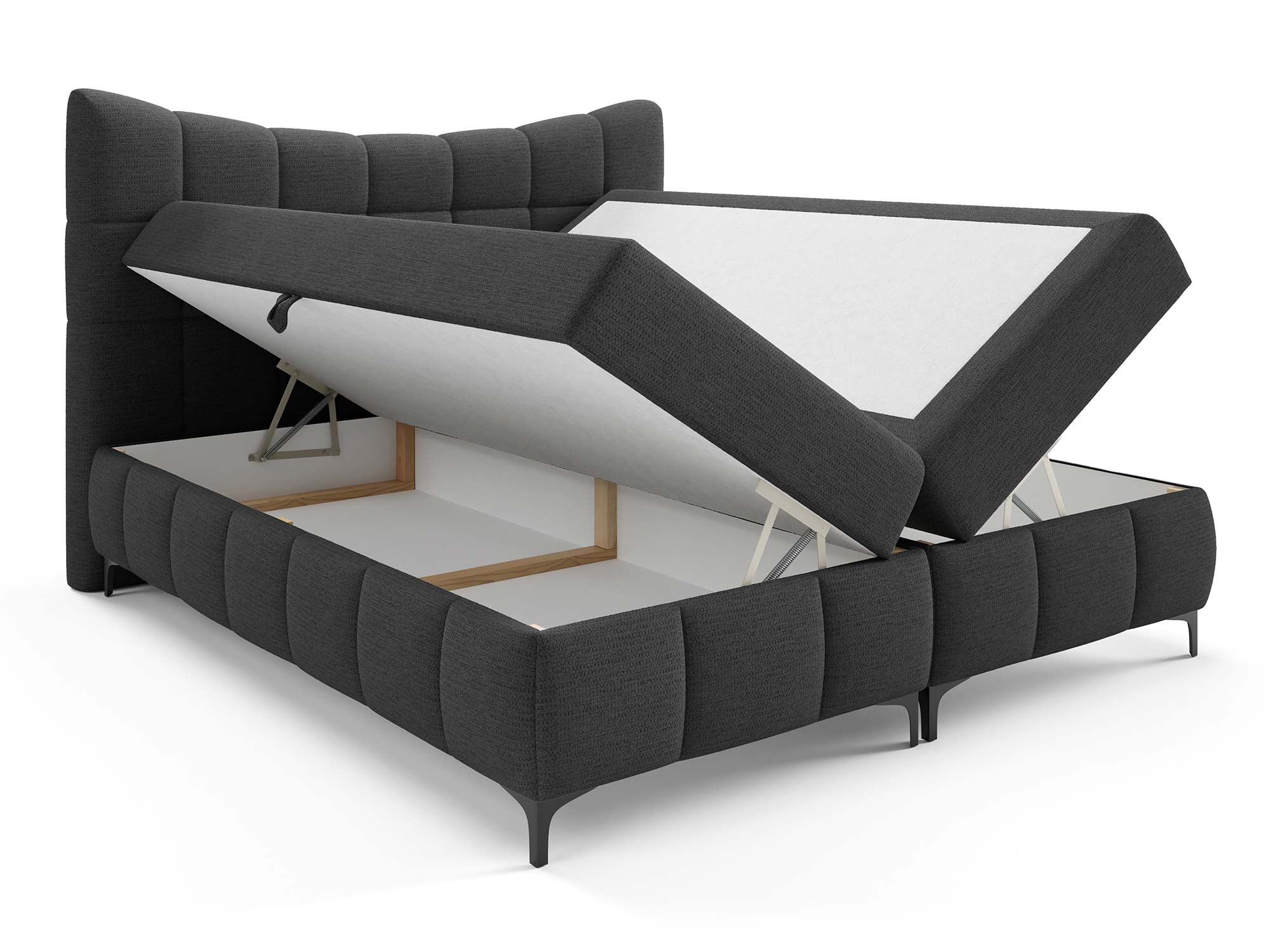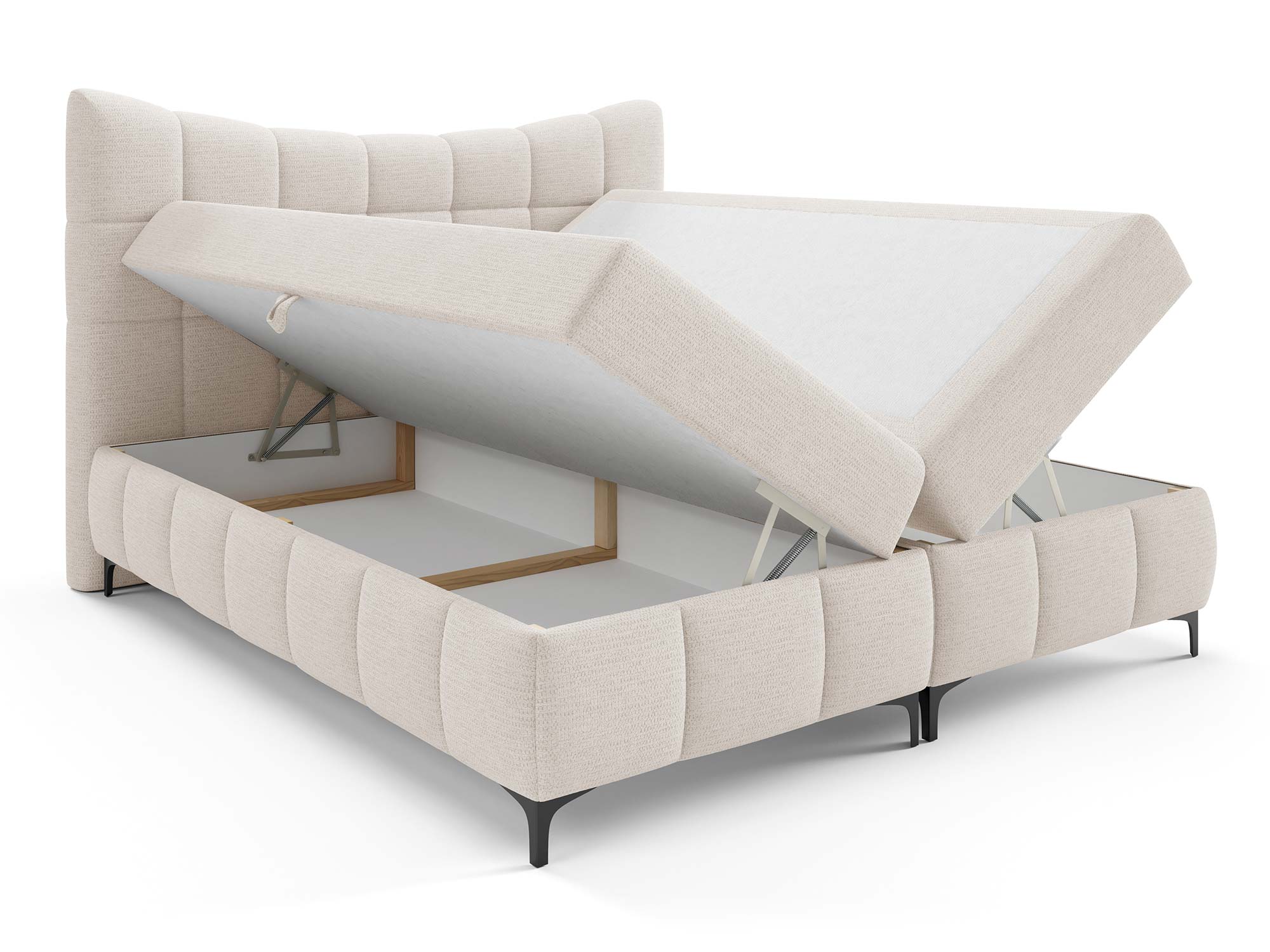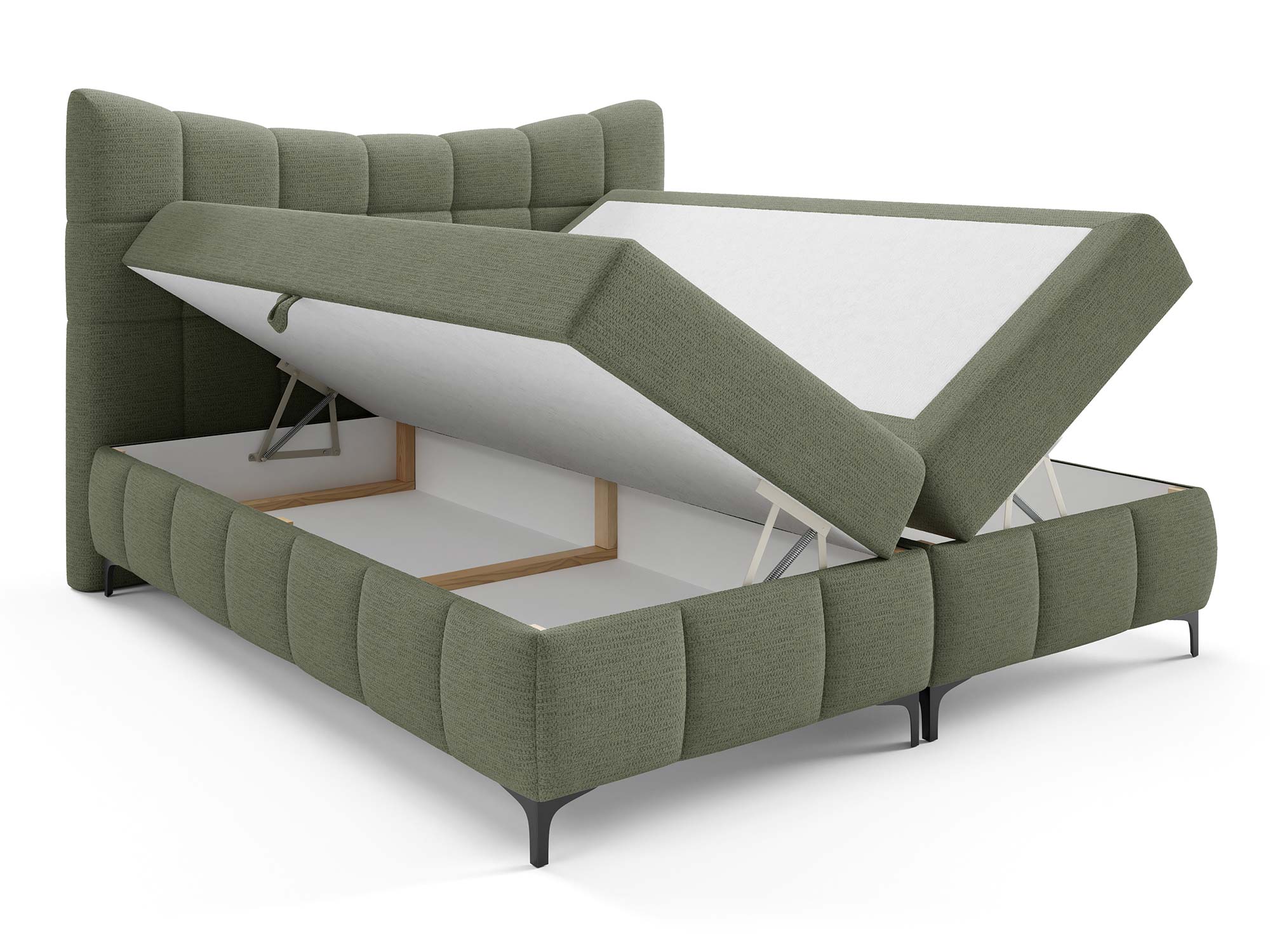 Ogromnym atutem są dwa pojemniki na pościel. Dzięki nim z łatwością przechowasz kołdry, poduszki, narzuty czy sezonowe tekstylia. Automat na sprężynach sprawia, że dostęp do tej przestrzeni jest szybki i bez wysiłku – wystarczy lekko unieść powierzchnię spania, aby odsłonić pojemne schowki.