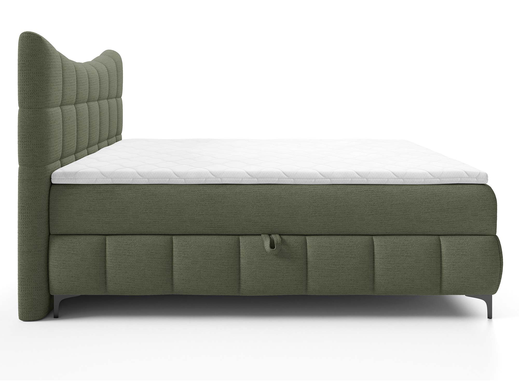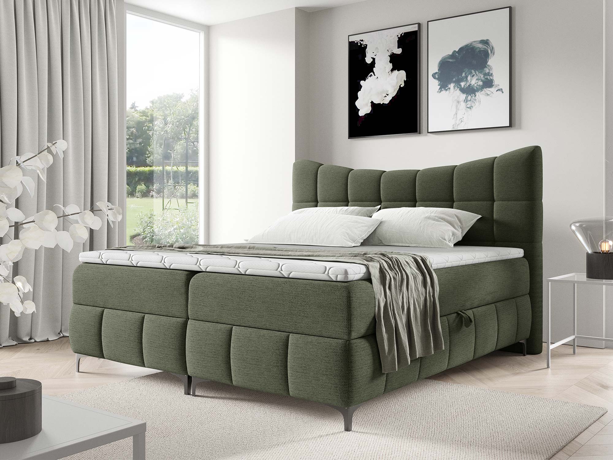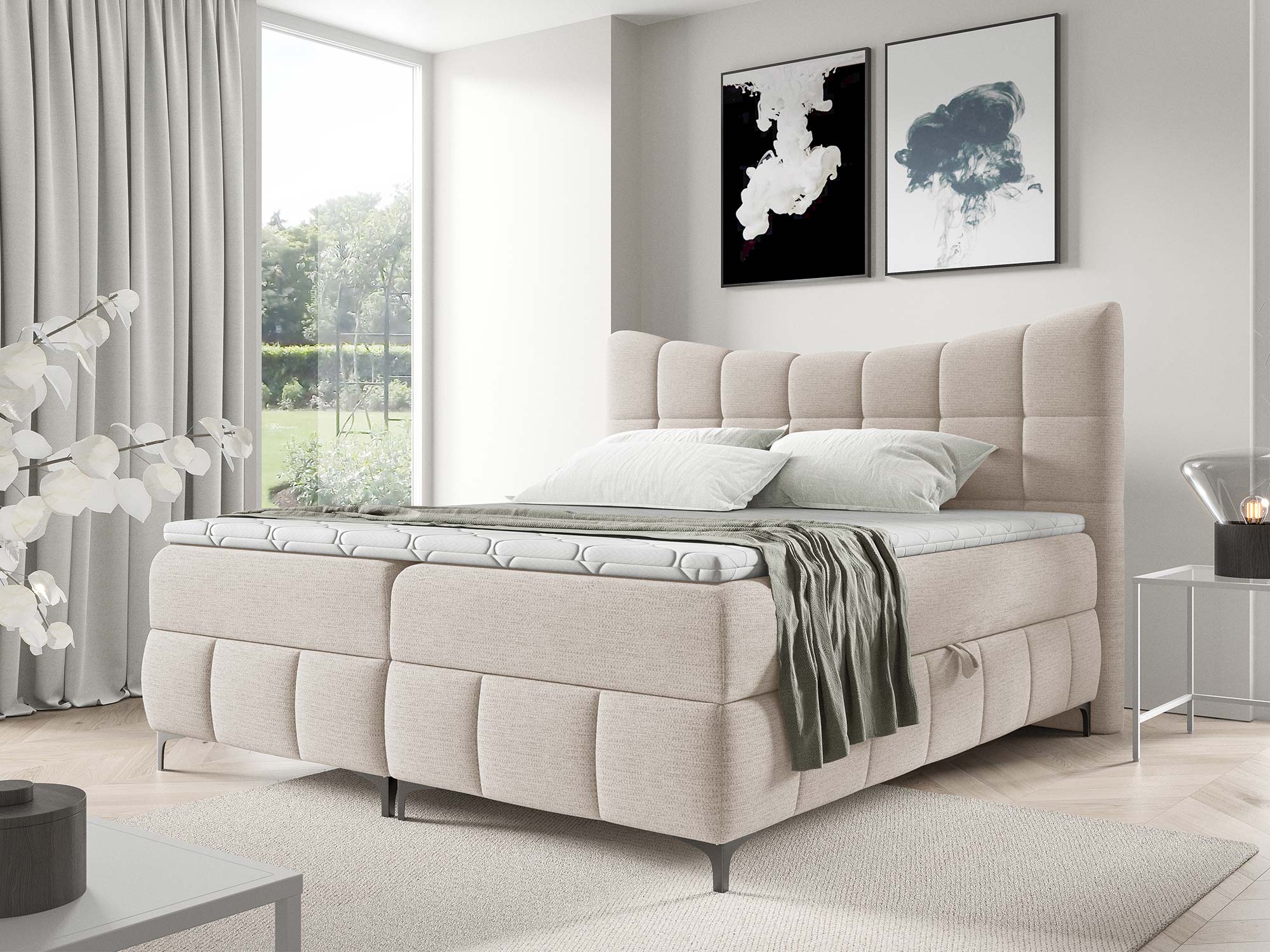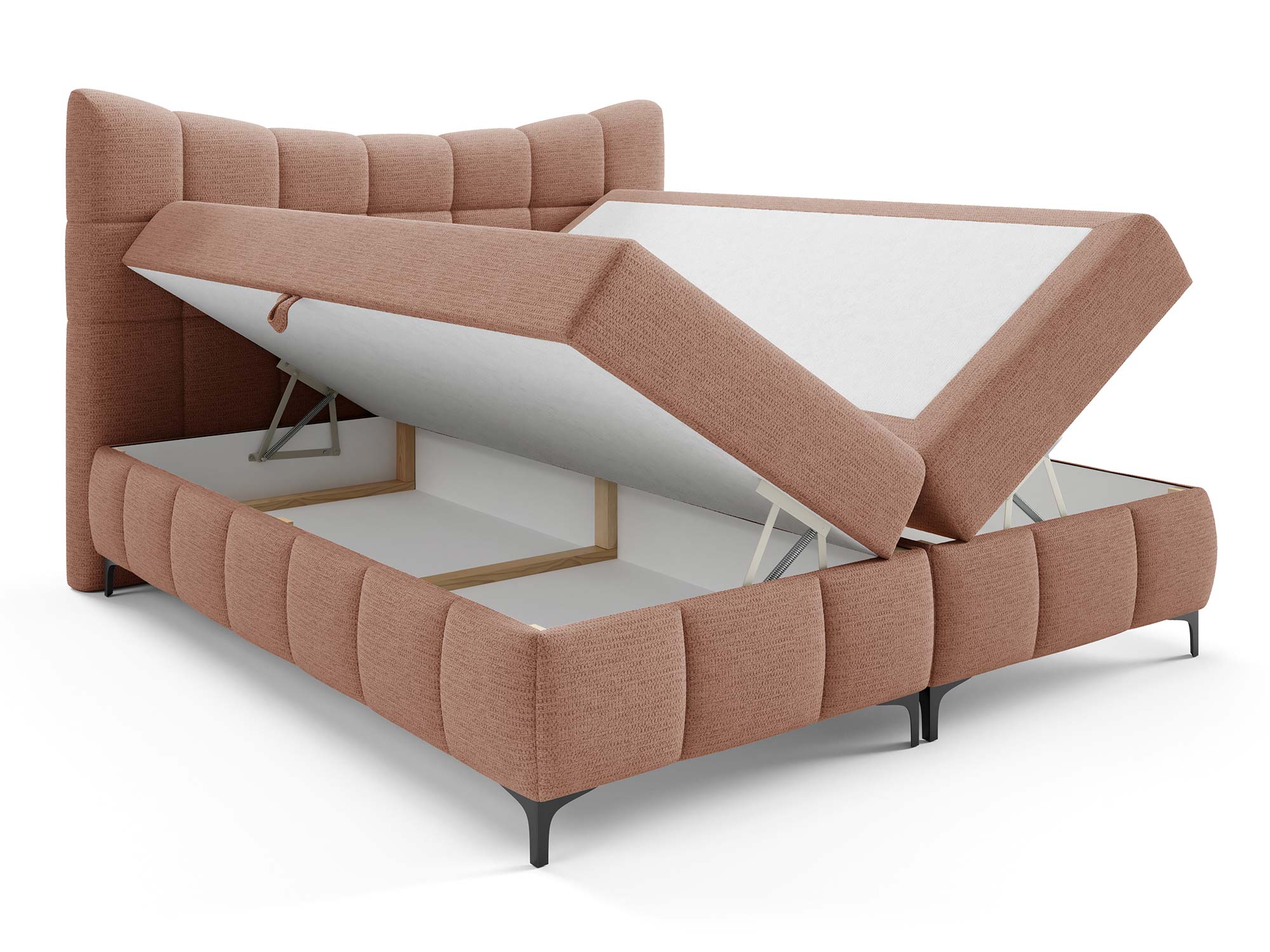 Ogromnym atutem są dwa pojemniki na pościel. Dzięki nim z łatwością przechowasz kołdry, poduszki, narzuty czy sezonowe tekstylia. Automat na sprężynach sprawia, że dostęp do tej przestrzeni jest szybki i bez wysiłku – wystarczy lekko unieść powierzchnię spania, aby odsłonić pojemne schowki.