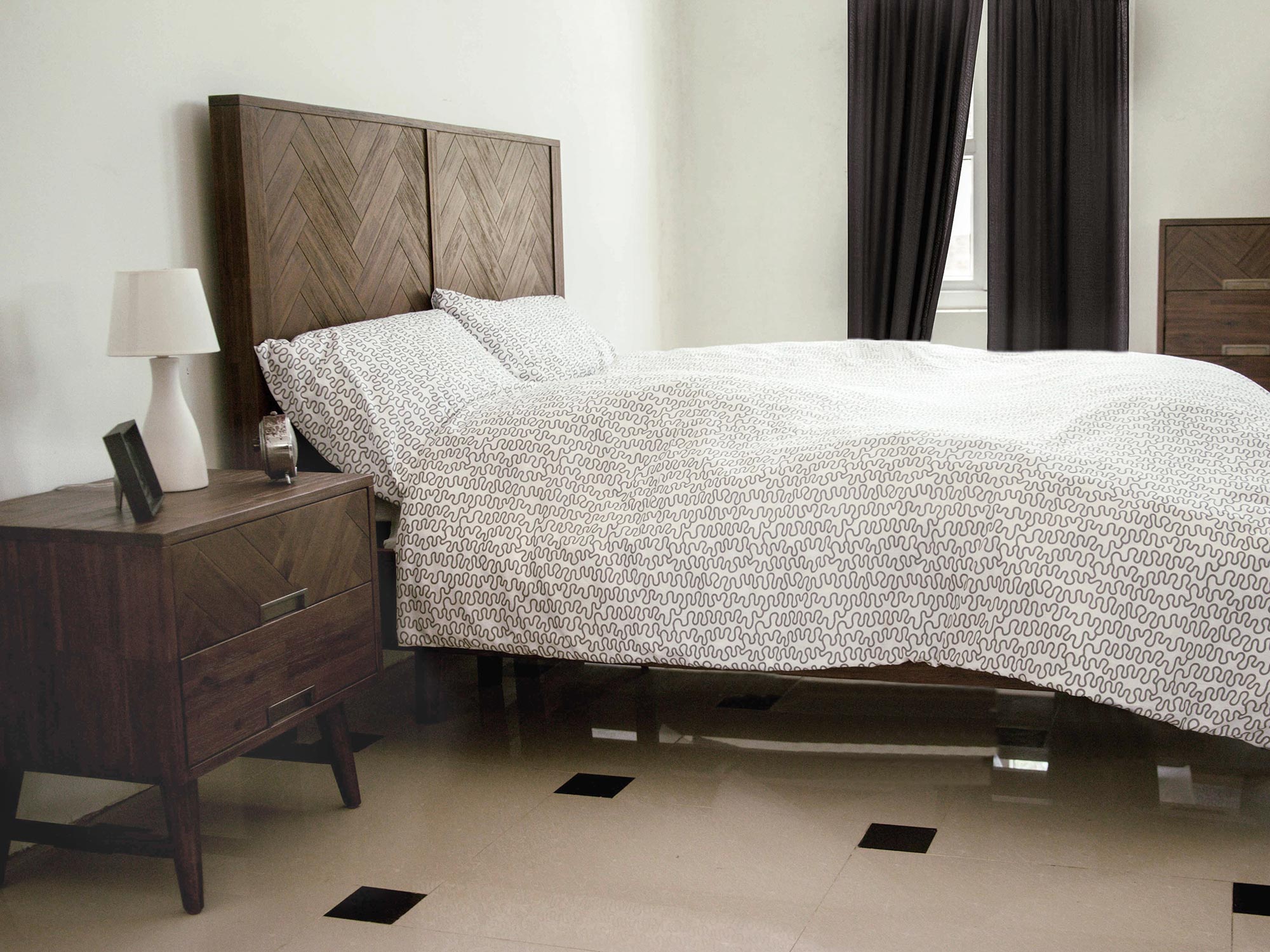 - Elegancki design z frontami z intarsją, który dodaje luksusowego charakteru każdej sypialni.
