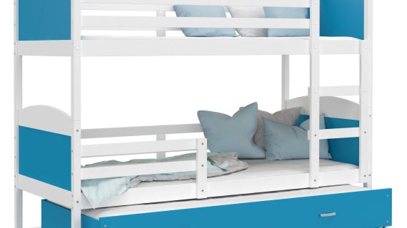 Łóżko piętrowe trzyosobowe DYZIO 3 to mebel, który cechuje się wygodą, bezpiecznym użytkowaniem i niepowtarzalnym charakterem. Stabilna i trwała struktura gwarantują solidność łóżka a także jego trwałość. Mebel zrobiono z wysokiego gatunku płyty MDF o zaokrąglonych krawędziach i profilowanymi bokami, które mają na celu zagwarantować bezpieczeństwo śpiącym dzieciom. Do łóżka dołączono pakową szufladę wysuwaną na kółkach przeznaczoną do przechowywania pościeli oraz do spania, drabinkę ułatwiającą wejście na piętro łóżka oraz barierki ochronne, które uniemożliwiają wypadnięcie dziecka, a także stelaż flex zrobiony z sprężynujących listw osadzonych w plastikowych kieszonkach. Do wyboru jest też materac z pianki w pokrowcu o grubości 7 cm. Przez wzgląd na bogactwo wykończeń i stylów w jakich zorganizowano dziecięce sypialnie nasze produkty są dostępne w kilku kolorach do wyboru. Do łóżka dołączono zestaw przeznaczony do montażu jak również instrukcja.