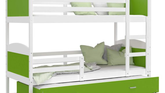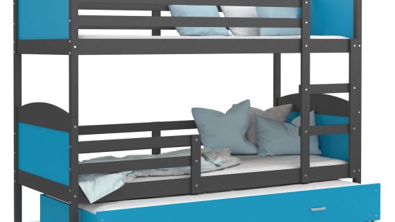 Demonstrowane po lewej łóżko piętrowe trzyosobowe DYZIO 3 to doskonała metoda na oszczędzenie cennego miejsca w domu czy mieszkaniu, które nie mają dużego metrażu a każdy kąt jest wysoce cenny. Produkt spaja nowoczesność i praktyczność a w dodatku wyjątkowo wygląda, jest wygodny i zabiera stosunkowo mało miejsca. Ze względu na solidne wykonanie mebel zniesie wszystkie dziecięce harce oraz bez wątpienia posłuży długi okres czasu. Nasze produkty bez problemu dopasują się do panującej stylizacji dlatego że występują w różnych kolorach, które są trwałe i nie blakną z upływem czasu. Gwarancja obejmująca okres dwóch lat to dodatkowy atut produktu.