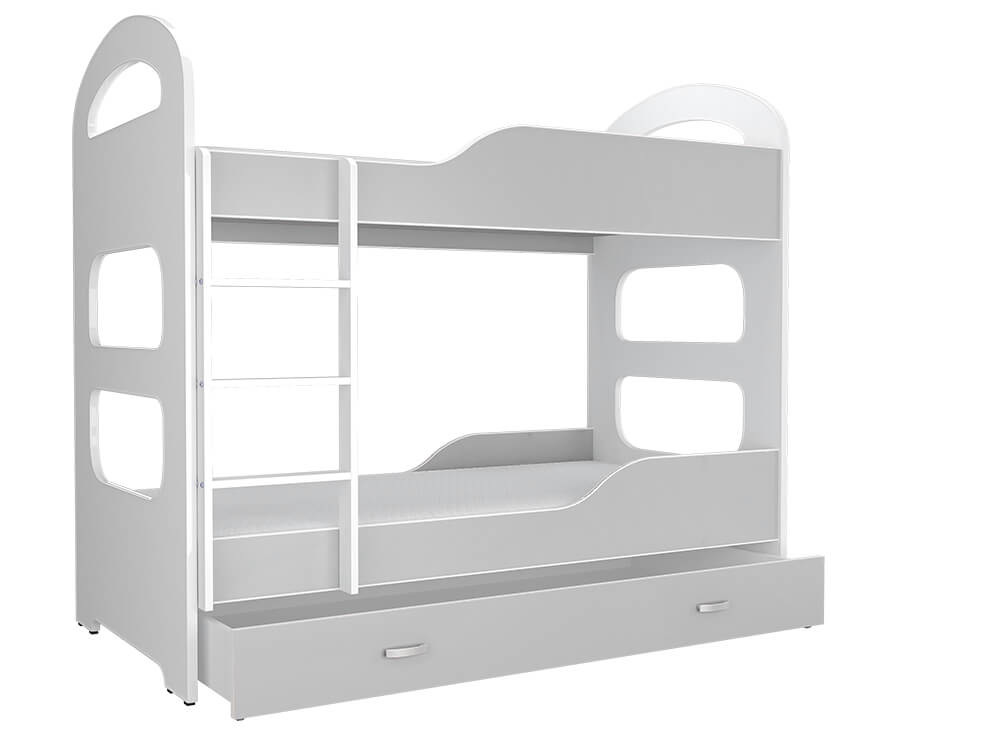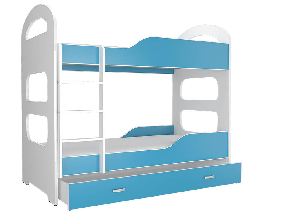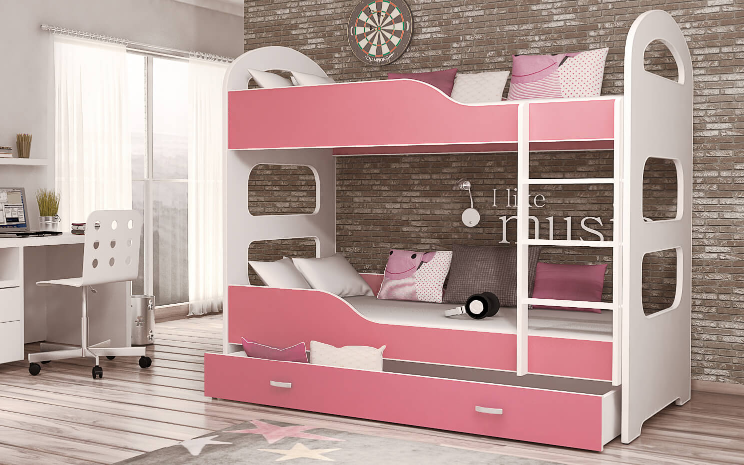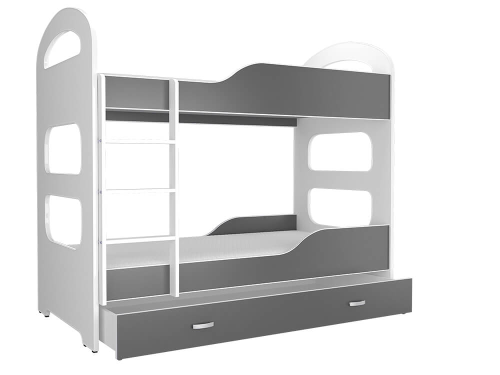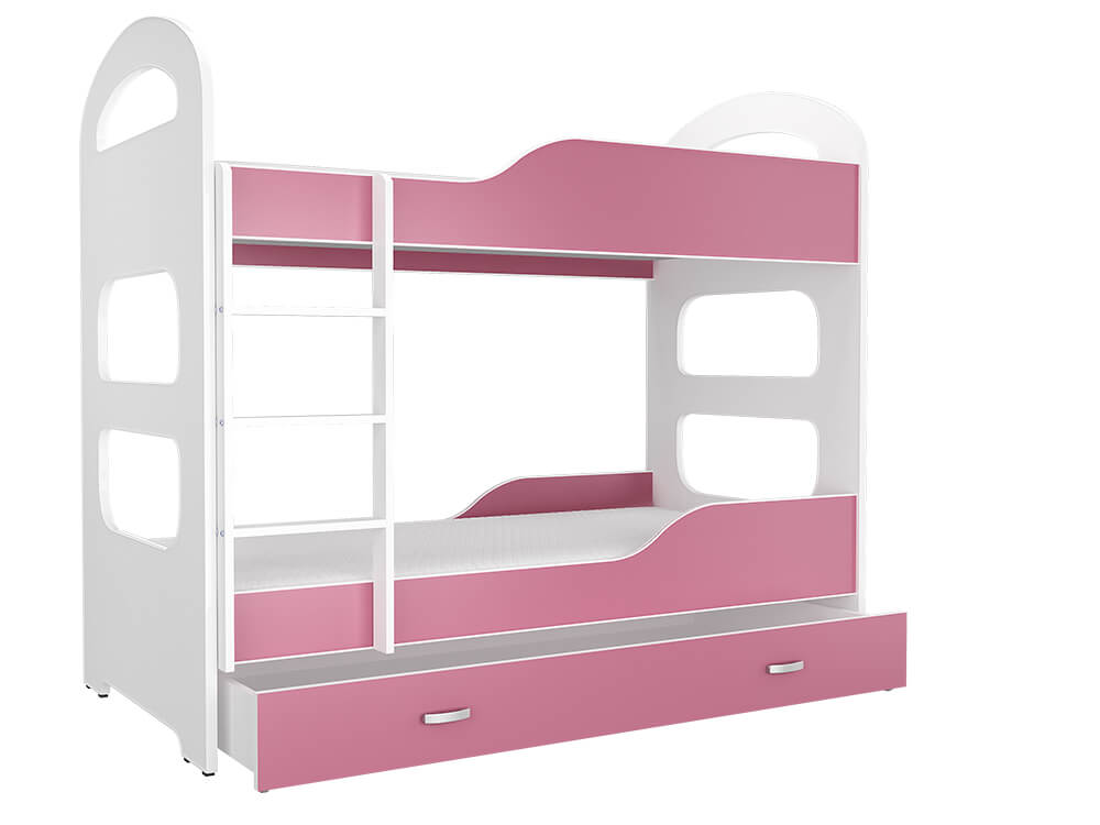 Piętrowe łóżko dla dziecka JACK to produkt, który cechuje się wygodą, bezpiecznym użytkowaniem i świeżym designem. Wytrzymała i mocna struktura zapewniają odporność łóżka a także jego trwałość. Mebel zrobiono z wysokiej jakości płyty MDF o zaokrąglonych krawędziach i wyprofilowanymi ściankami, które mają za zadanie zapewnić bezpieczeństwo śpiącym dzieciom. Łóżko posiada pojemną wysuwaną na kółkach szufladę dedykowaną do przechowywania pościeli, drabinkę która ułatwia wejście na wyższy poziom łóżka oraz barierki ochronne, które uniemożliwiają wypadnięcie dziecka, a także stelaż flex wykonany z osadzonych w plastikowych kieszonkach sprężynujących listw. Do wyboru jest też materac z pianki w pokrowcu o grubości 7 cm. Przez wzgląd na rozmaitość charakterów i wykończeń w jakich zorganizowano dziecięce sypialnie nasze produkty są dostępne w wielu wybarwieniach do wyboru, są to m.in biały, różowy, zielony, niebieski, szary. Do łóżka został dodany zestaw przeznaczony do montażu jak również instrukcja.