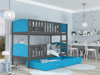Demonstrowane na zdjęciu po lewej łóżko piętrowe z pojemnikiem na pościel DUMBO to doskonała metoda na zyskanie wartościowego miejsca w domu czy mieszkaniu, które nie mają dużego metrażu a każdy obszar jest niezwykle cenny. Produkt wiąże ze sobą takie właściwości jak funkcjonalności i innowacyjność a w dodatku wspaniale wygląda, jest komfortowy i zajmuje stosunkowo mało miejsca. Dzięki solidnemu wykonaniu mebel zniesie wszystkie dziecięce zabawy oraz bezsprzecznie posłuży przez długi czas. Oferowane przez nas produkty bez problemu dopasują się do panującej stylizacji dlatego że występują w różnych kolorach, które są trwałe i nie blakną z upływem czasu. Dwuletnia gwarancja to dodatkową zaletę produktu.