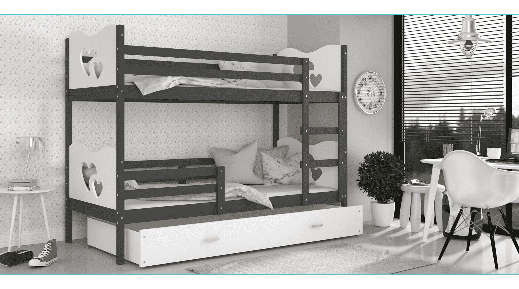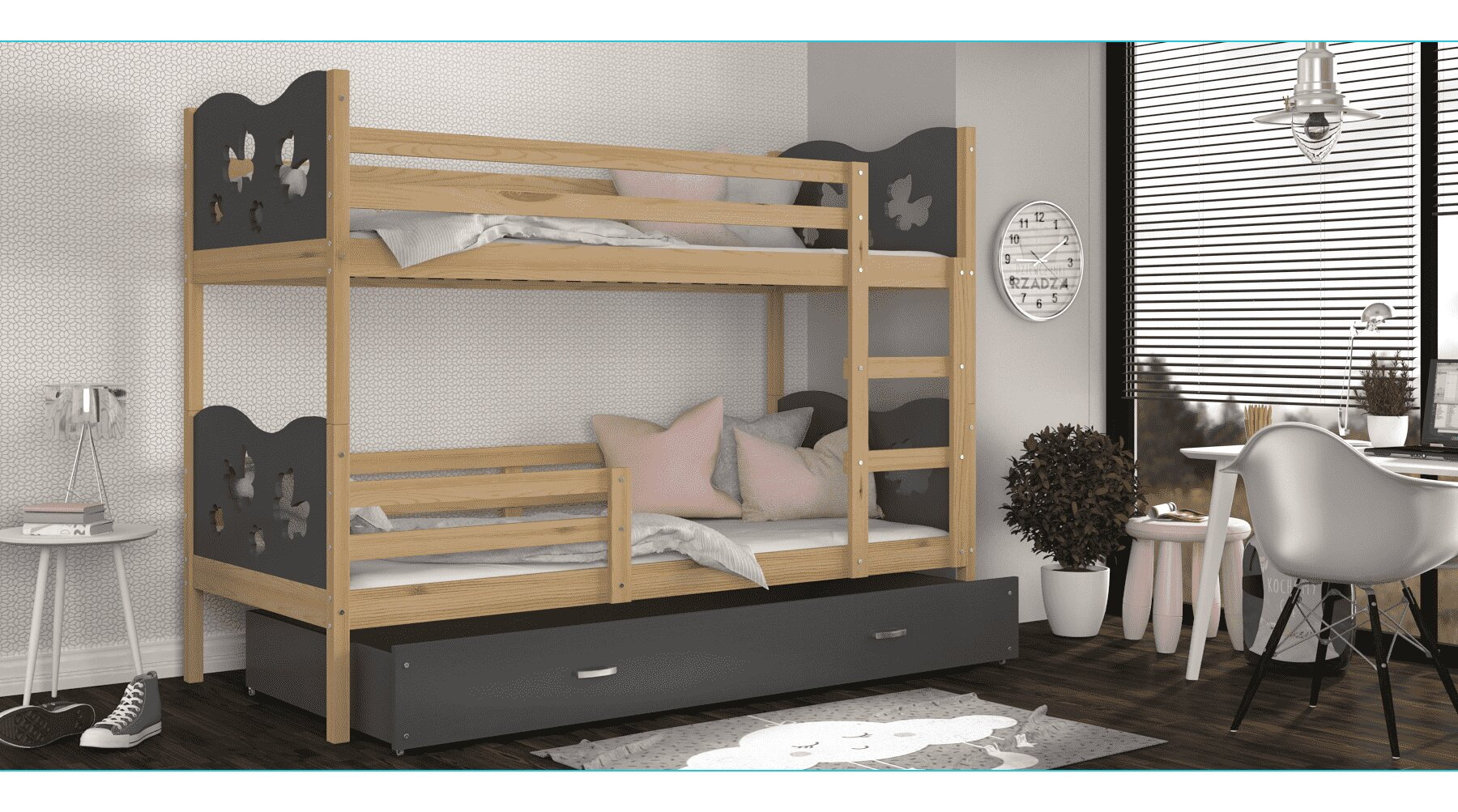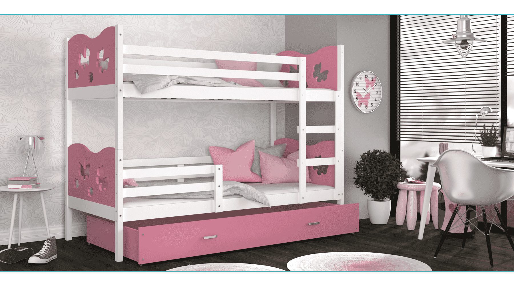 Łóżko piętrowe dla dziecka JERRY to mebel, który charakteryzuje się wygodą, bezpiecznym użytkowaniem i oryginalnym designem. Wytrzymała i trwała konstrukcja gwarantują odporność łóżka a także jego wytrzymałość. Mebel zrobiono z wysokiego gatunku płyty MDF i sosnowego drewna o zaokrąglonych krawędziach i wyprofilowanymi ściankami, które mają za zadanie zagwarantować bezpieczeństwo śpiącym dzieciom. Do łóżka dołączono pojemną wysuwaną na kółkach szufladę przeznaczoną do przechowywania pościeli, drabinkę która ułatwia wejście na wyższy poziom łóżka oraz barierki ochronne, które uniemożliwiają wypadnięcie dziecka, a także stelaż flex wykonany z osadzonych w plastikowych kieszonkach sprężynujących listw. W opcji jest też piankowy materac w pokrowcu o grubości 7 cm. Przez wzgląd na bogactwo estetyki i form w jakich urządzono dziecięce pokoje nasze produkty są dostępne w wielu kolorach oraz wzorach do wyboru. Do łóżka został dodany zestaw przeznaczony do montażu jak również instrukcja.