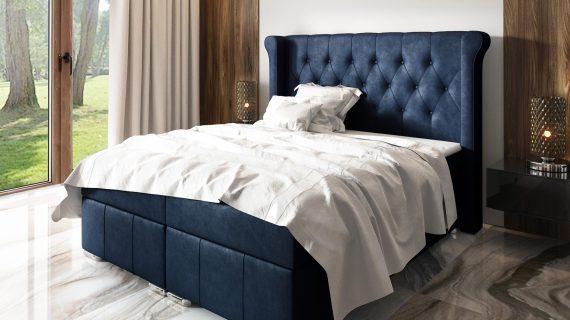 Granatowe łóżko welurowe z dekoracyjnymi guzikami