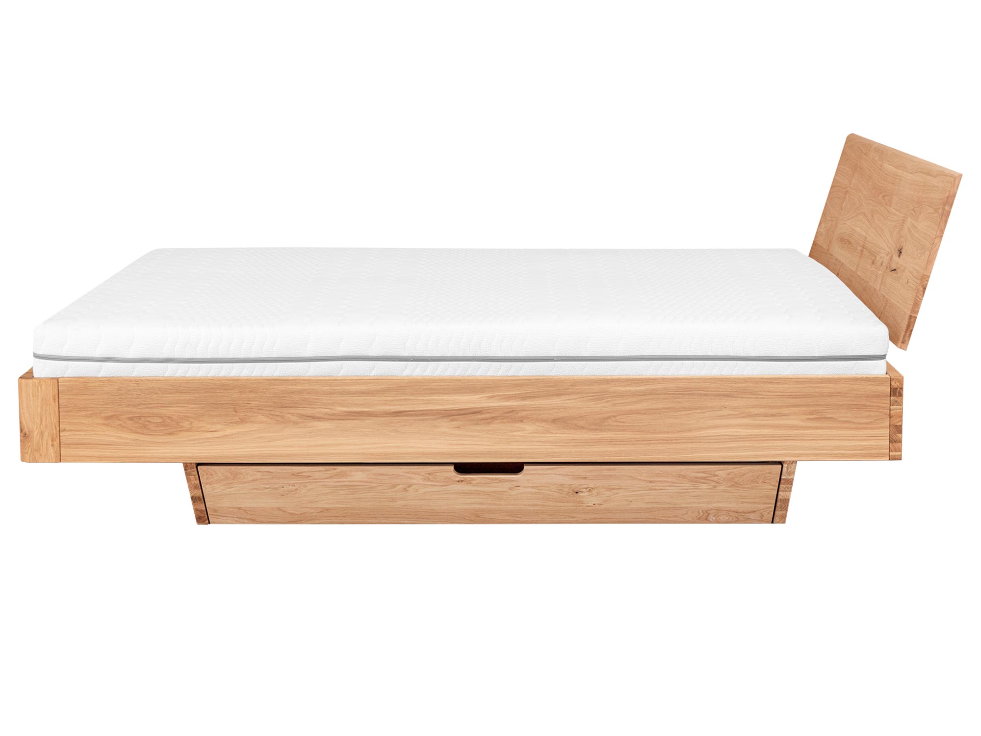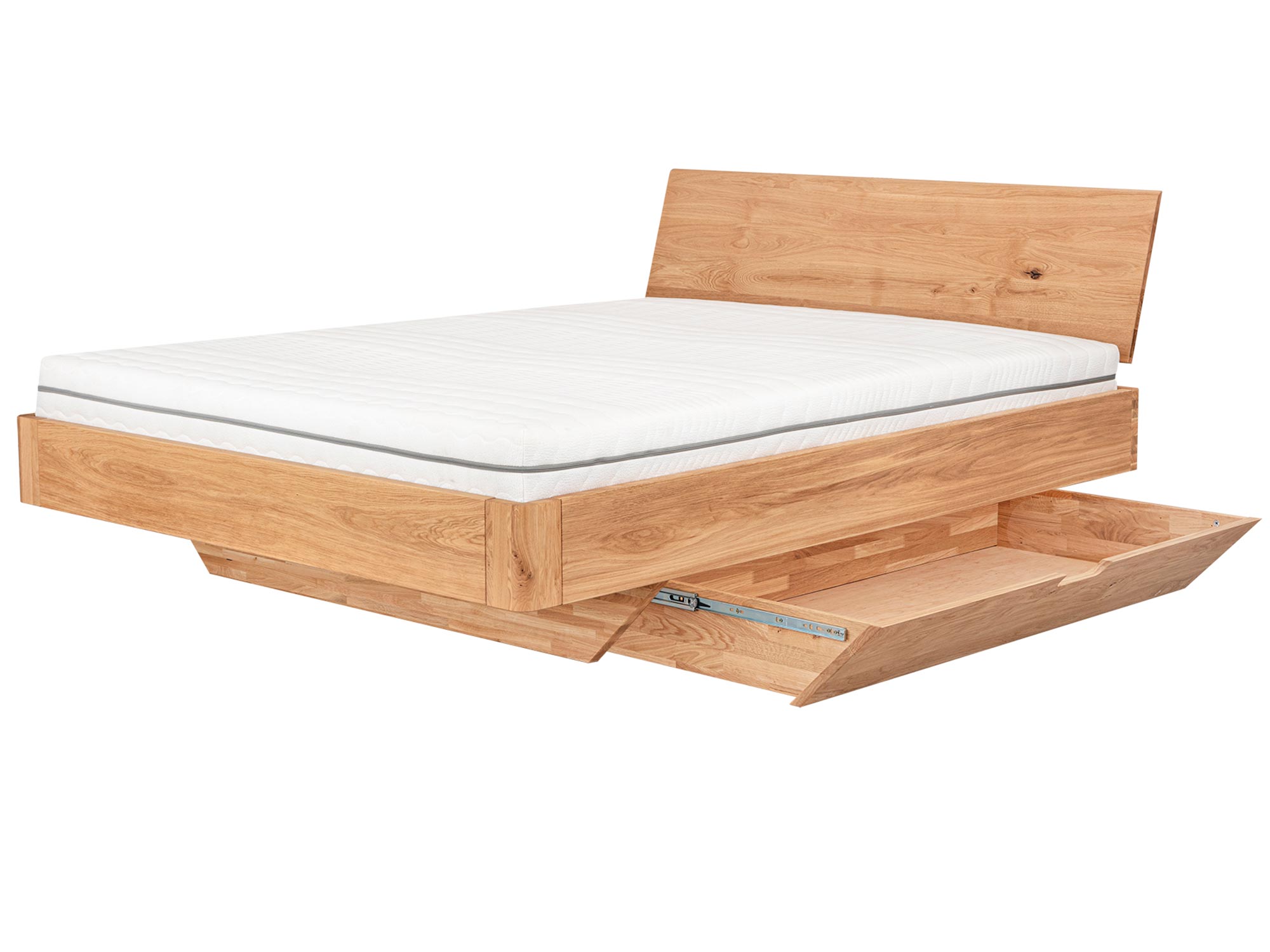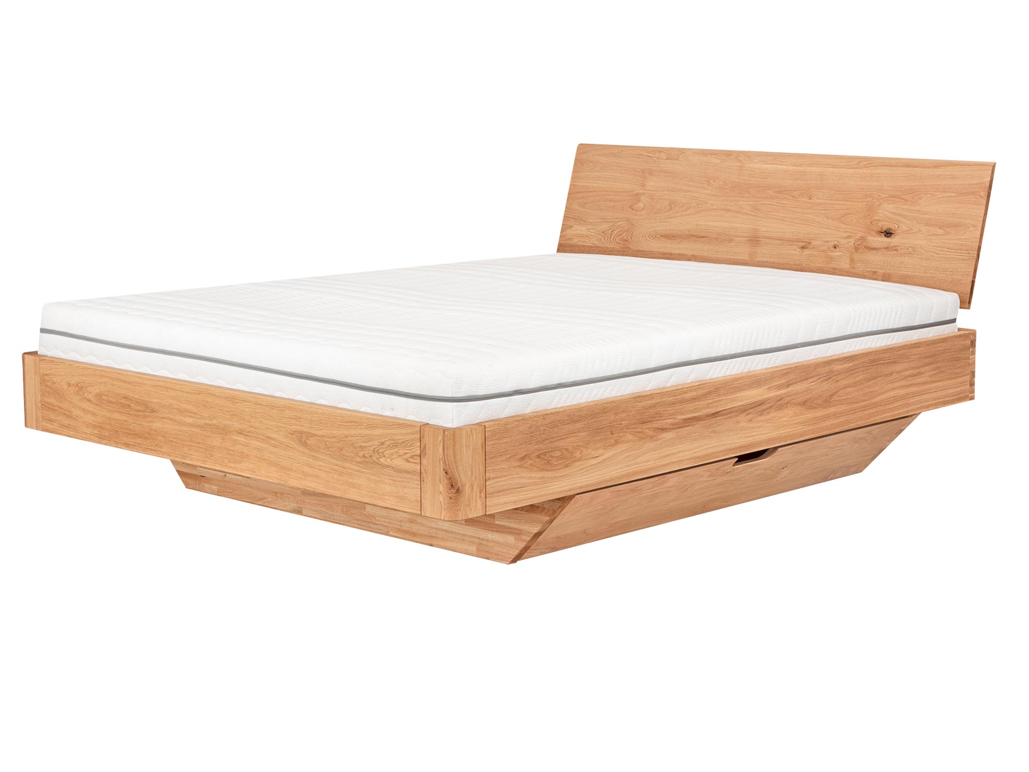 Współczesny minimalizm kocha praktyczność, dlatego Elona A projektowano jak garderobę w wersji „ukrytej”. Szuflady w cokole nie zaburzają czystości formy – są schowane, gładko zintegrowane z podstawą, a ich linia subtelnie znika w jednolitej bryle dębu. To harmonia estetyki i funkcji, która pozwala realnie zapanować nad rzeczami w sypialni – bez kompromisów w wyglądzie.